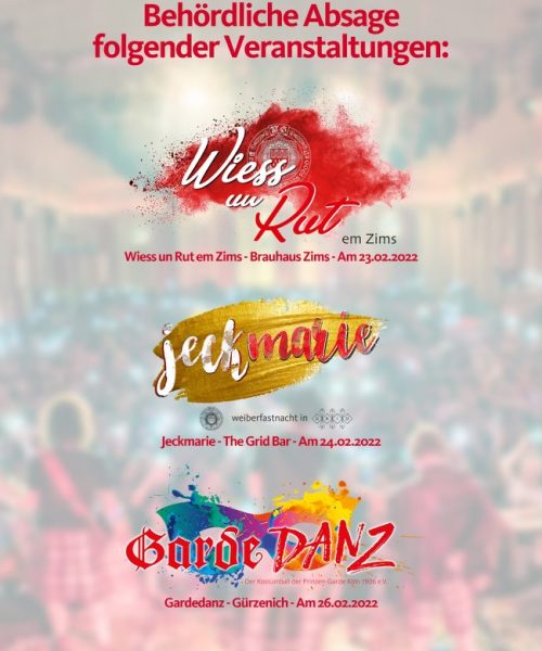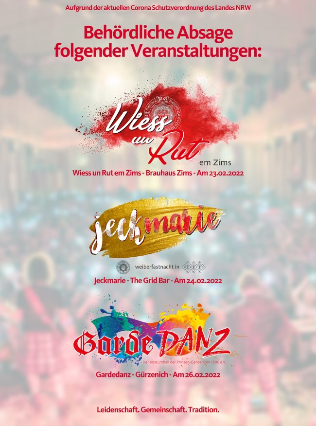 Aufgrund der derzeitigen gesundheitlichen Lage wegen des starken Anstiegs an Covid-19-Infektionen und aufgrund der aktuellen, ab dem 09. Februar 2022 gültigen Fassung der CoronaSchVO NRW (§ 5) und der daraus resultierenden Untersagung öffentlicher Party- bzw. Tanzveranstaltungen bis einschließlich 09. März 2022 sind unsere Veranstaltungen