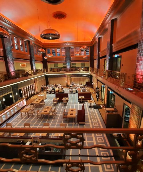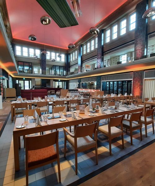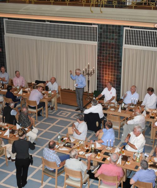 Im ehemaligen Schwimmbecken, wo auch das Essen serviert wurde, war Platz genug für die 40 Korpskameraden, die der Einladung von Uli gefolgt sind. Der Chef des Hauses, Rainer Siewertz, gab einen interessanten Einblick in die Historie und Architektur des 1913 erbauten Gebäudes.