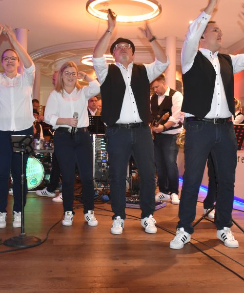 Präsident Dino Massi und Kommandant Marcel Kappestein begrüßten persönlich, direkt am Eingang der Brauerei, jeden der gut 130 Korpskameraden, das designierte Kölner Dreigestirn und viele Freunde aus den anderen Kölner Traditionskorps. Rainer Brüser hatte ein tolles Programm für uns zusammengestellt. Es muss ihm auch gut gefallen haben, denn bei der Gruppe „Swinging Funfares“ tanzte Rainer ausgelassen mit vielen Freunden in der ersten Reihe mit. Und was trinkt man in der Krombacher Brauerei? Natürlich Krombacher Plis und dieses floss reichlich.