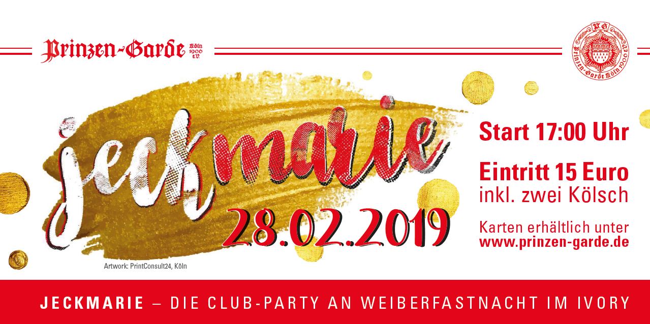 - JECKMARIE – Weiberfastnacht im Ivory! Zum zweiten Mal öffnen die Prinzen-Garde Köln und der Club Ivory auf der Limburger Str. an Weiberfastnacht die Pforten und bitten zur ausgelassenen Kostümparty in toller Clubathmosphäre. Zwei Dancefloors (ein Floor nur Kölsche Musik und ein Floor Kölsche Musik gemischt mit Charts) bieten genug Gelegenheit zum feiern und tanzen.