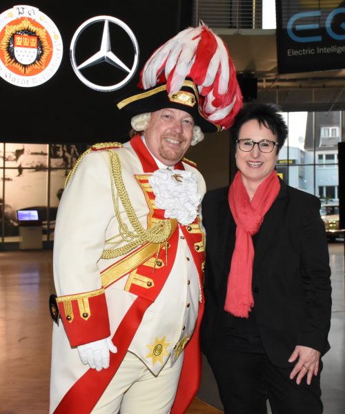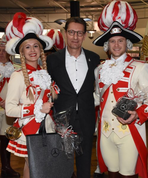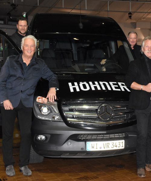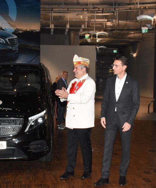 Wer kommt denn da gegen Ende dieser schönen Veranstaltung herein geflogen? Es sind die Höhner, die ebenfalls ihren Wagen für die Session in Empfang genommen haben. Da bietet sich aber ein Gruppenfoto von zwei Giganten im Kölner Karneval und dem Global Player Mercedes Benz an.