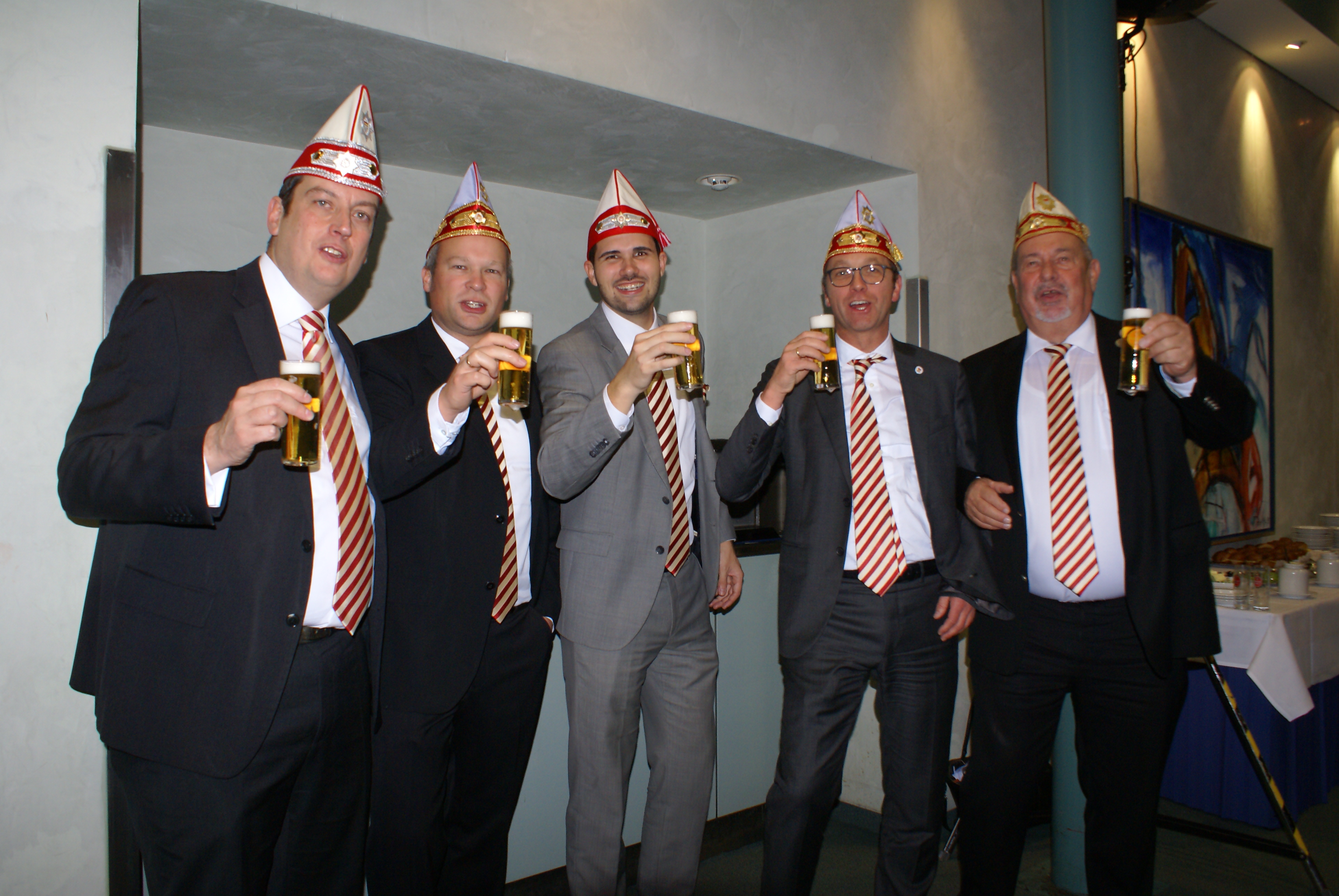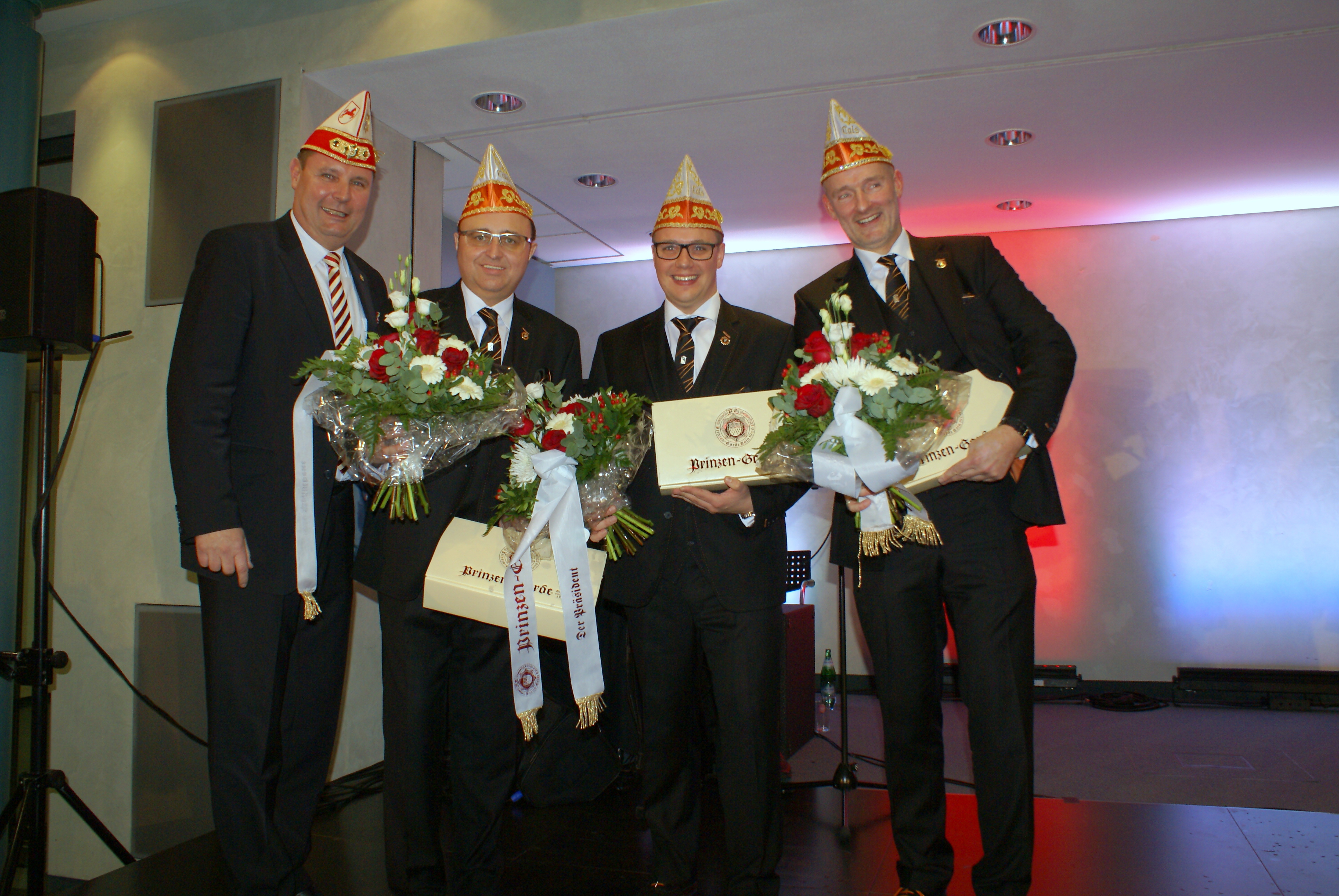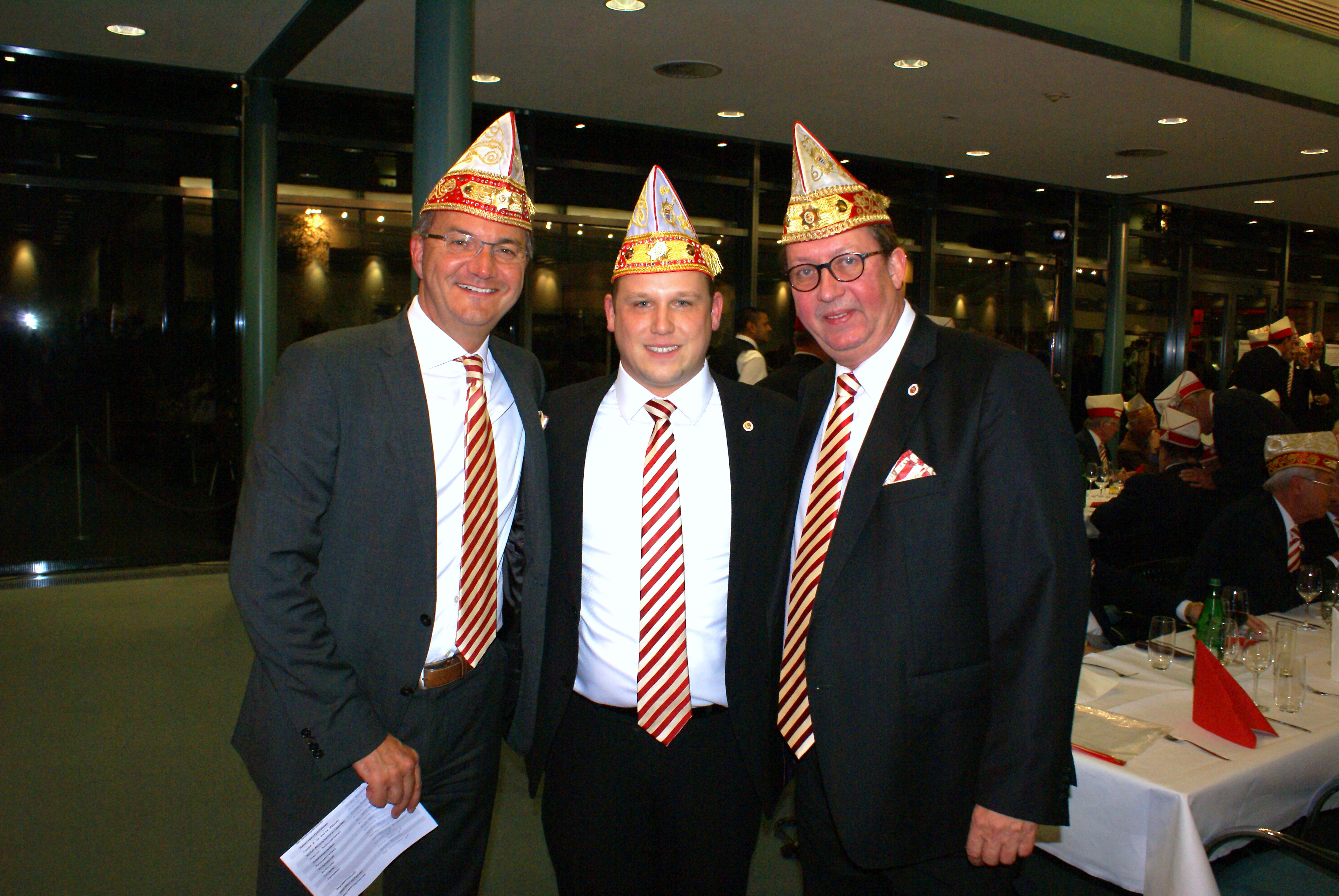 Präsident Dino Massi und Kommandant Marcel Kappestein stimmten das Korps mit ihren Reden auf die neue Session ein und beide blickten noch einmal auf die sehr erfolgreiche Session zum 111-jährigen Bestehen der Prinzen-Garde zurück. Dann hatte das designierte Dreigestirn den ersten großen Auftritt und konnte schon mal zeigen, wie es sich dem närrischen Volk präsentieren will. Zwei Überraschungsmomente gab es, als unser neuer Adjutant des Prinzen, Michael Palm, zum Leutnant befördert wurde und als Michael Dreeser Dino eine alte Bronze Figur übergab, die wunderbar in unseren Turm passt. Als dann unser Spielmannszug aus Uerdingen einzog, hielt es keinen Prinzengardisten mehr auf seinem Stuhl.
