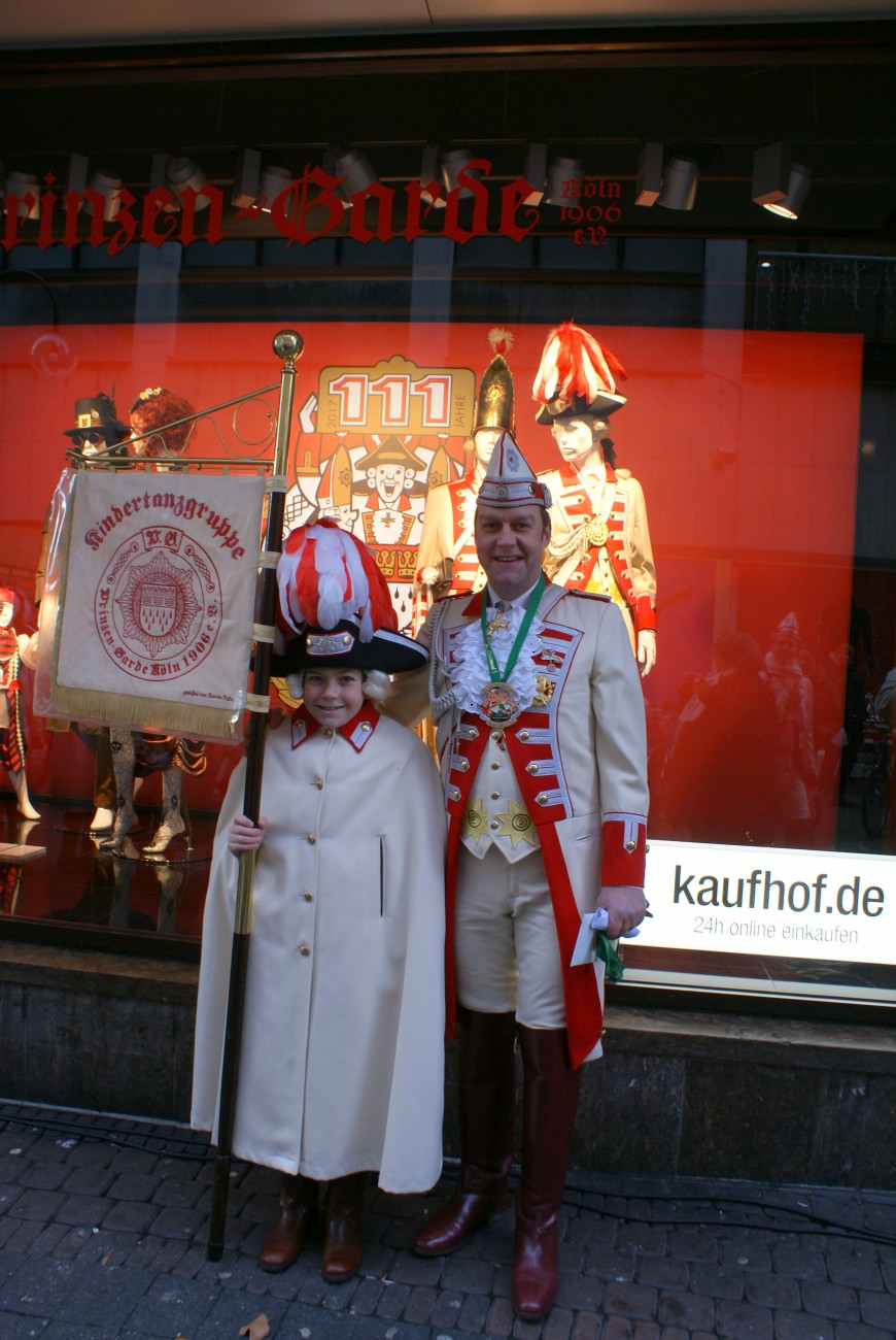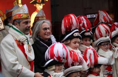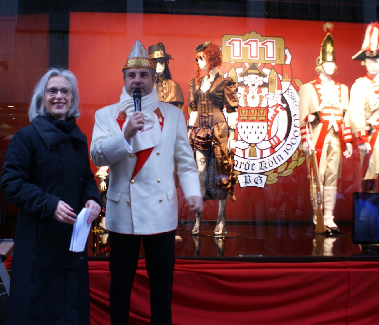 Aber auch Fußkorpsführer Marcel Kappestein, unser Corps à la suite Führer Thorsten Schmidt und die Kindergruppe der Prinzen-Garde sowie viele Korpskameraden haben den Termin, trotz kalter Temperaturen, wahrgenommen. Dino bedankte sich bei Frau Schepers für die Gestaltung des Fensters, das im Jubiläumsjahr der Prinzen-Garde noch bis Aschermittwoch zu sehen sein wird. Anschließend wurden noch die Fenster der Willi-Ostermann-Gesellschaft, die dieses Jahr 50 wird, und der Kölner Narren-Zunft, die das Kölner Dreigestirn stellt, enthüllt. Alle drei Fenster die an der Hohe Straße zu sehen sind, spiegeln ein Stück Kölner Karneval wieder.