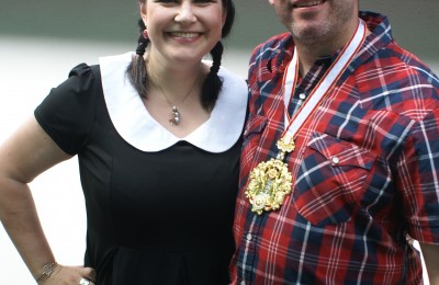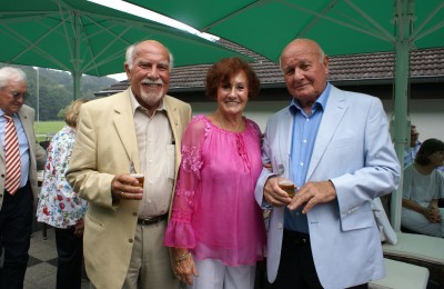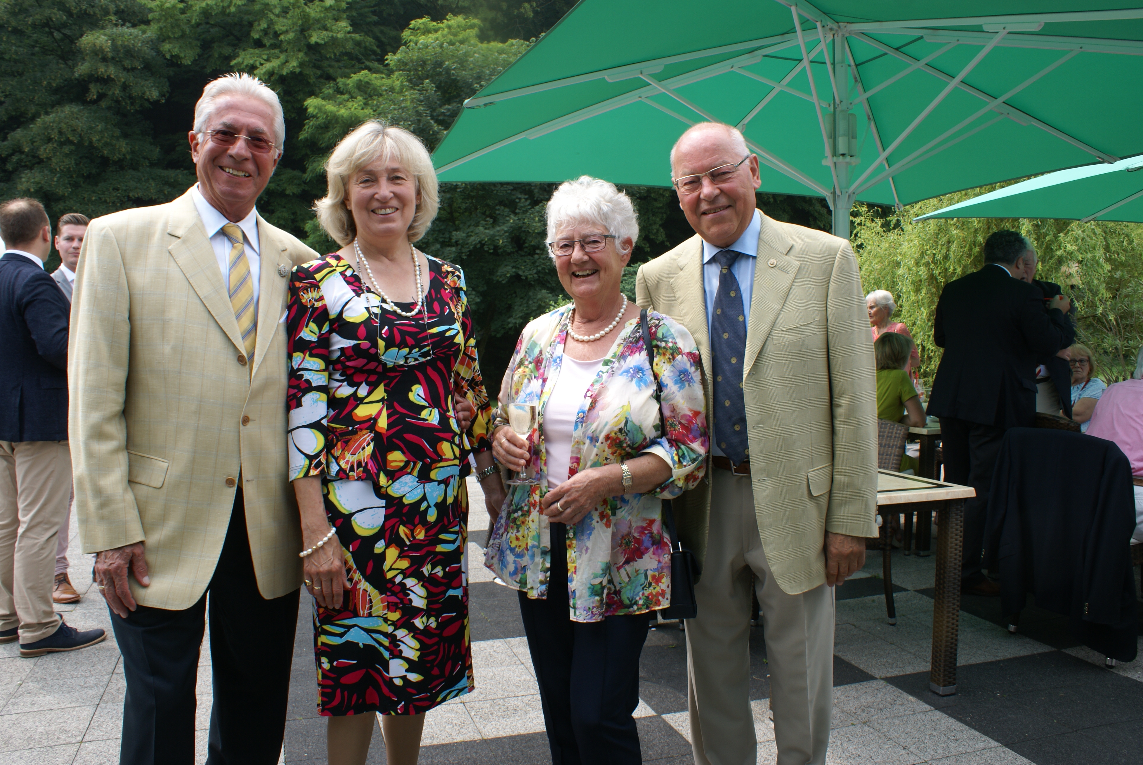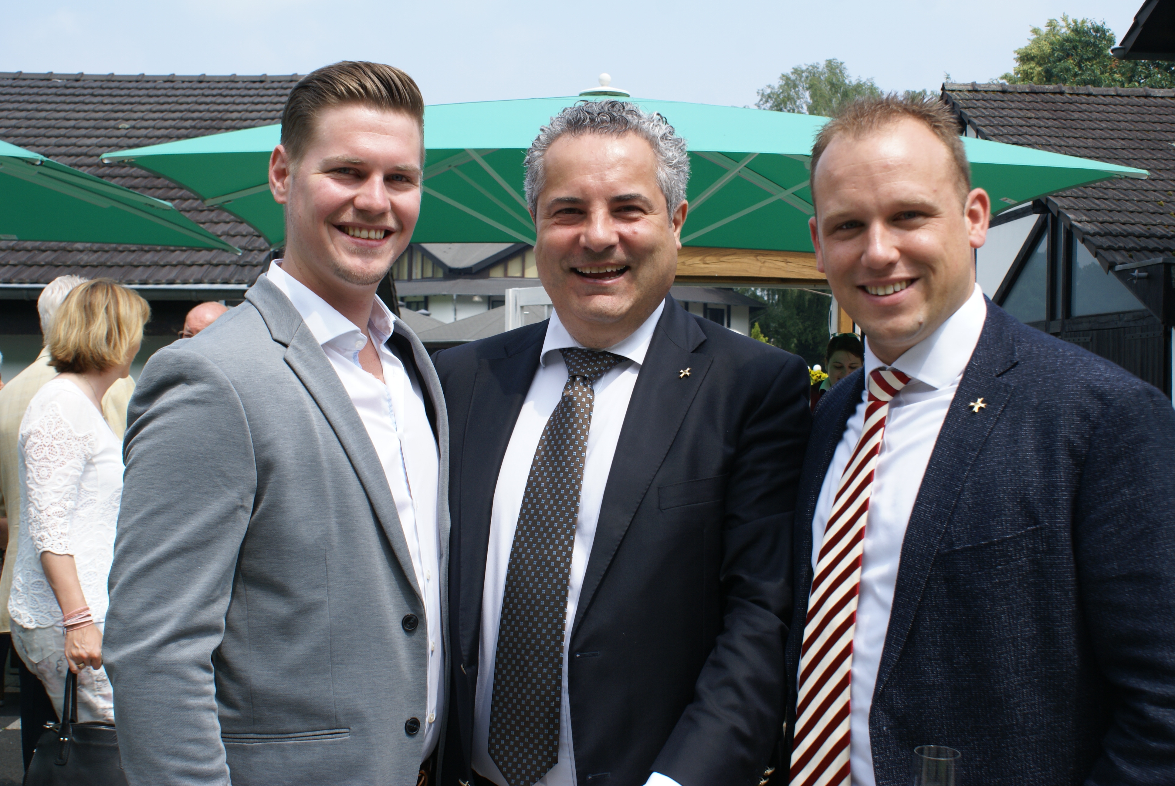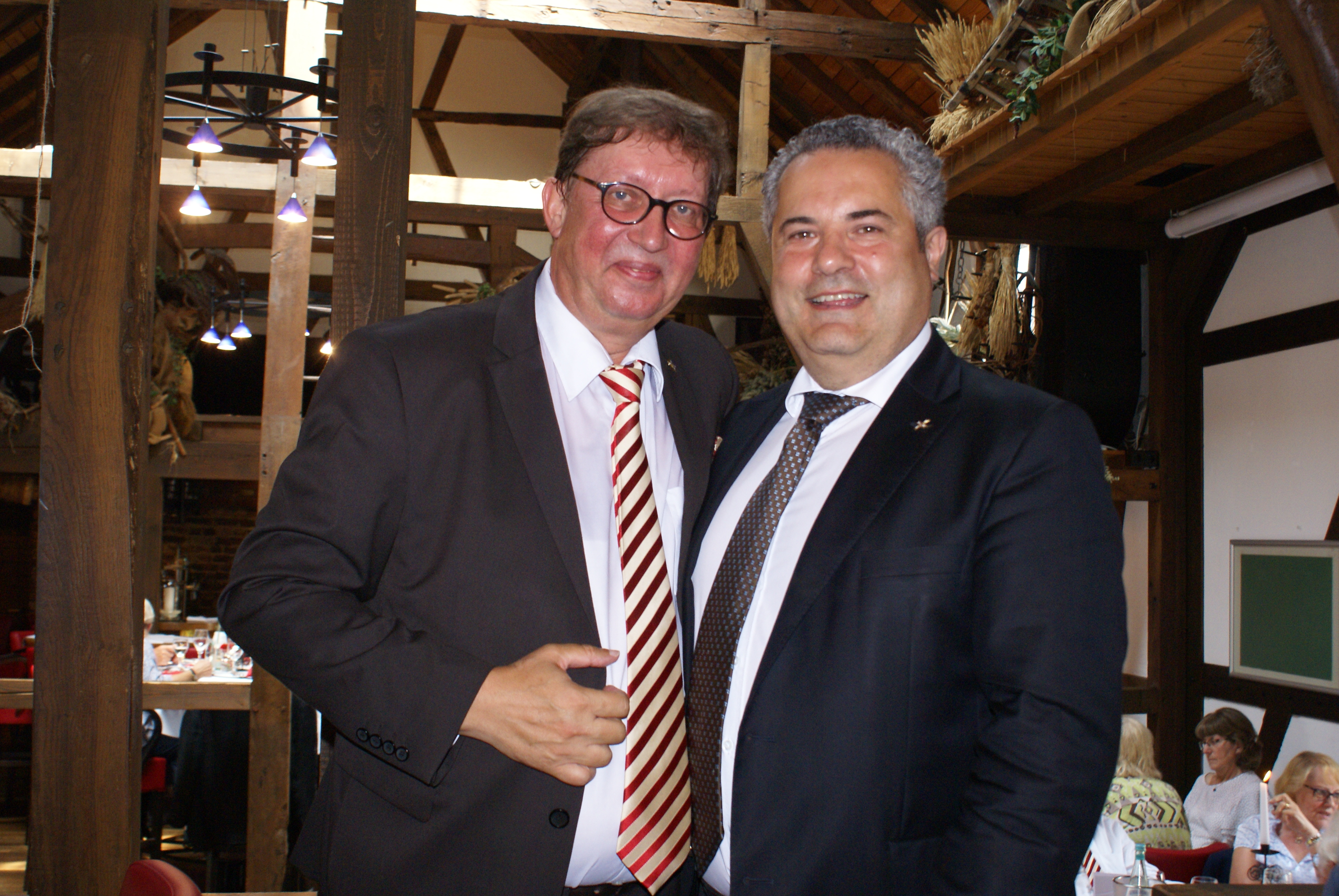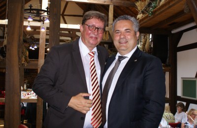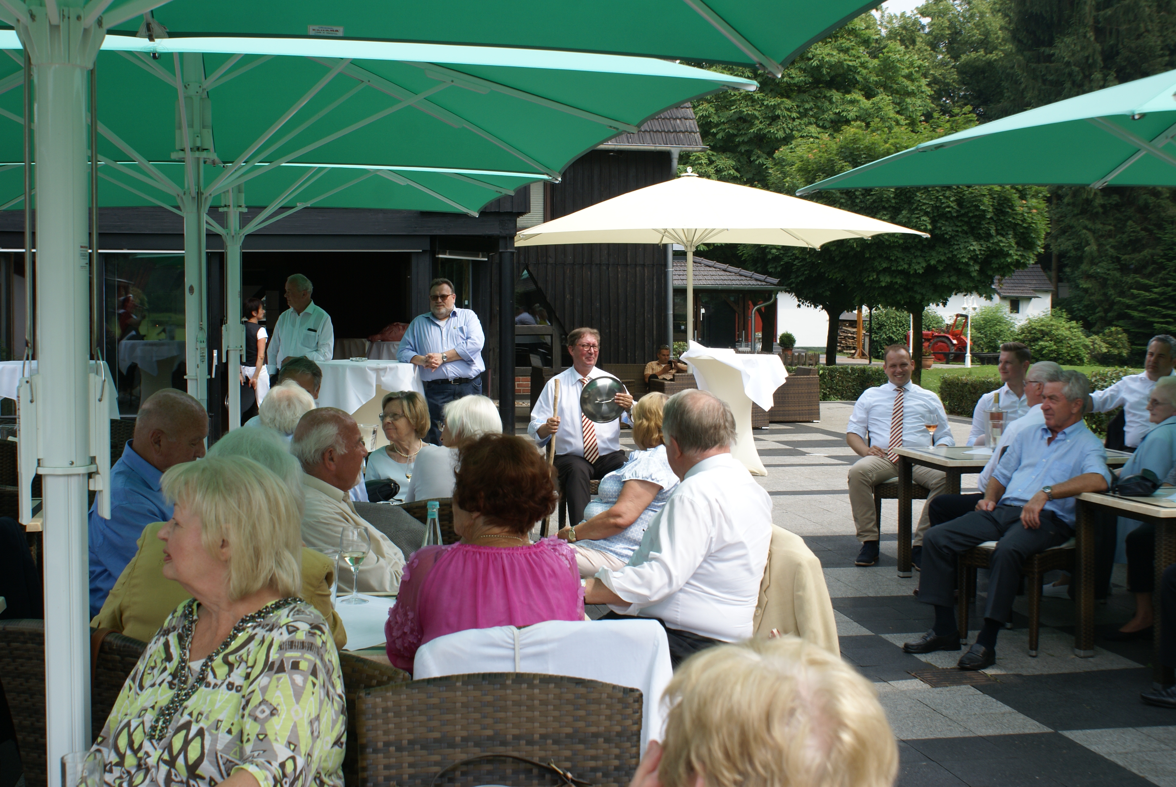 Dadurch bedingt war auch der Bustransfer vom Turm zum Naafs-Häuschen mit etwas Verspätung am Ziel angekommen. Das tat aber der guten Stimmung im Bus und auch im Naafs-Häuschen keinen Abbruch. Dass trotz der hohen Temperaturen und vieler Kranker noch 55 Gäste den Weg ins Bergische Land gefunden haben, dafür bedankte sich Reservekorpsführer Jürgen Wicharz in seiner Begrüßung ganz besonders. Es zeigte auch deutlich, dass diese Traditionsveranstaltung lebt. Ehrengäste dieses Tages waren unser Präsident Dino Massi mit seiner Frau Babette, Kommandant Marcell Kappestein und Tanzoffizier Alex Ritter. Nach Jürgen sprach Dino zu den Scheunenbesuchern. Er hatte einige Neuerungen und Veränderungen, die auch das Reservekorps betreffen, mit im Gepäck. Diese Infos aus erster Hand sind mit viel Applaus begrüßt worden.