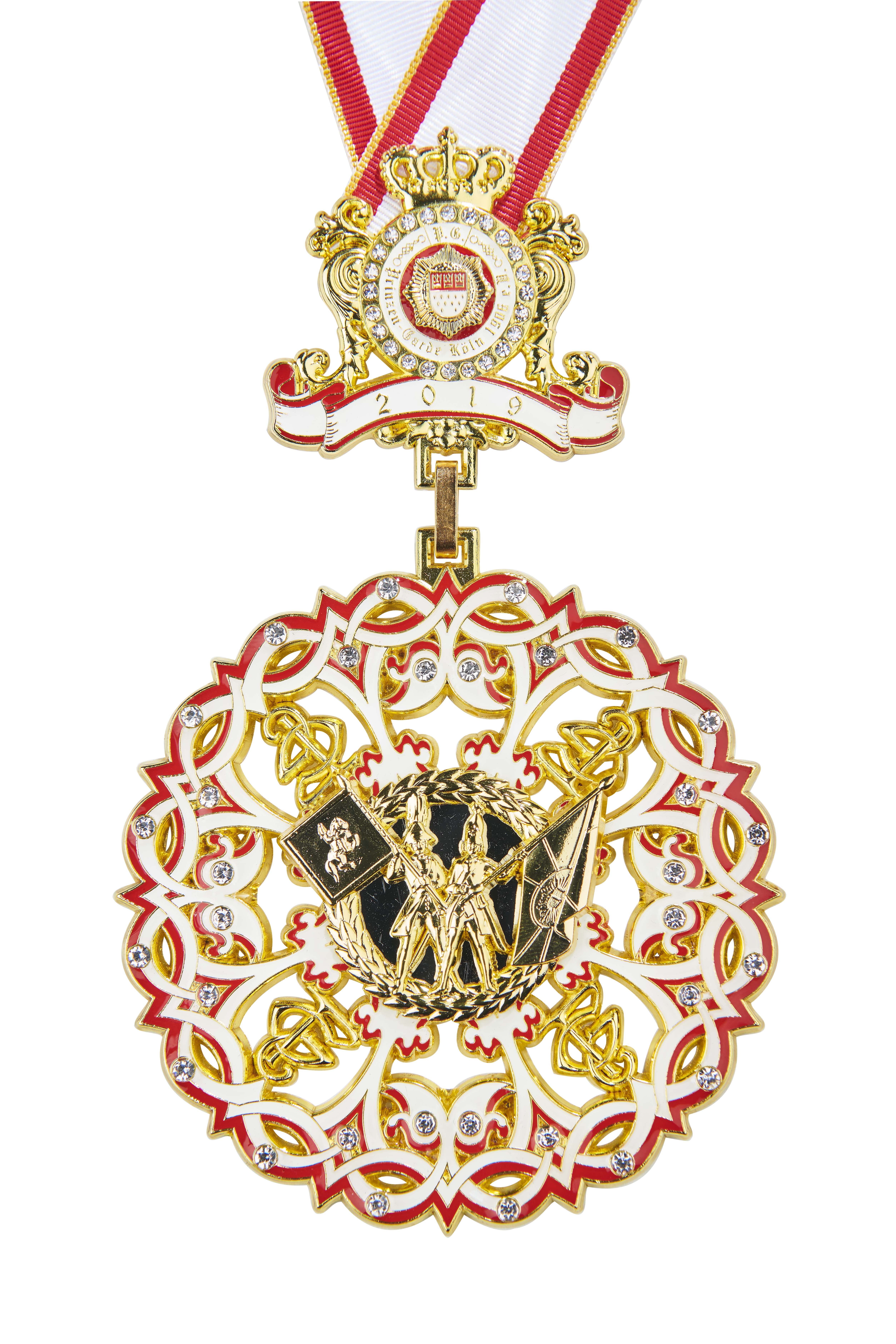 Im Rahmen des Generalkorpsappells am 10. Januar 2019 wurde wie im jeden Jahr auch der neue Sessionsorden vorgestellt. Natürlich erstrahlt er auch in diesem Jahr in den Gesellschaftsfarben Weiß und Rot.
