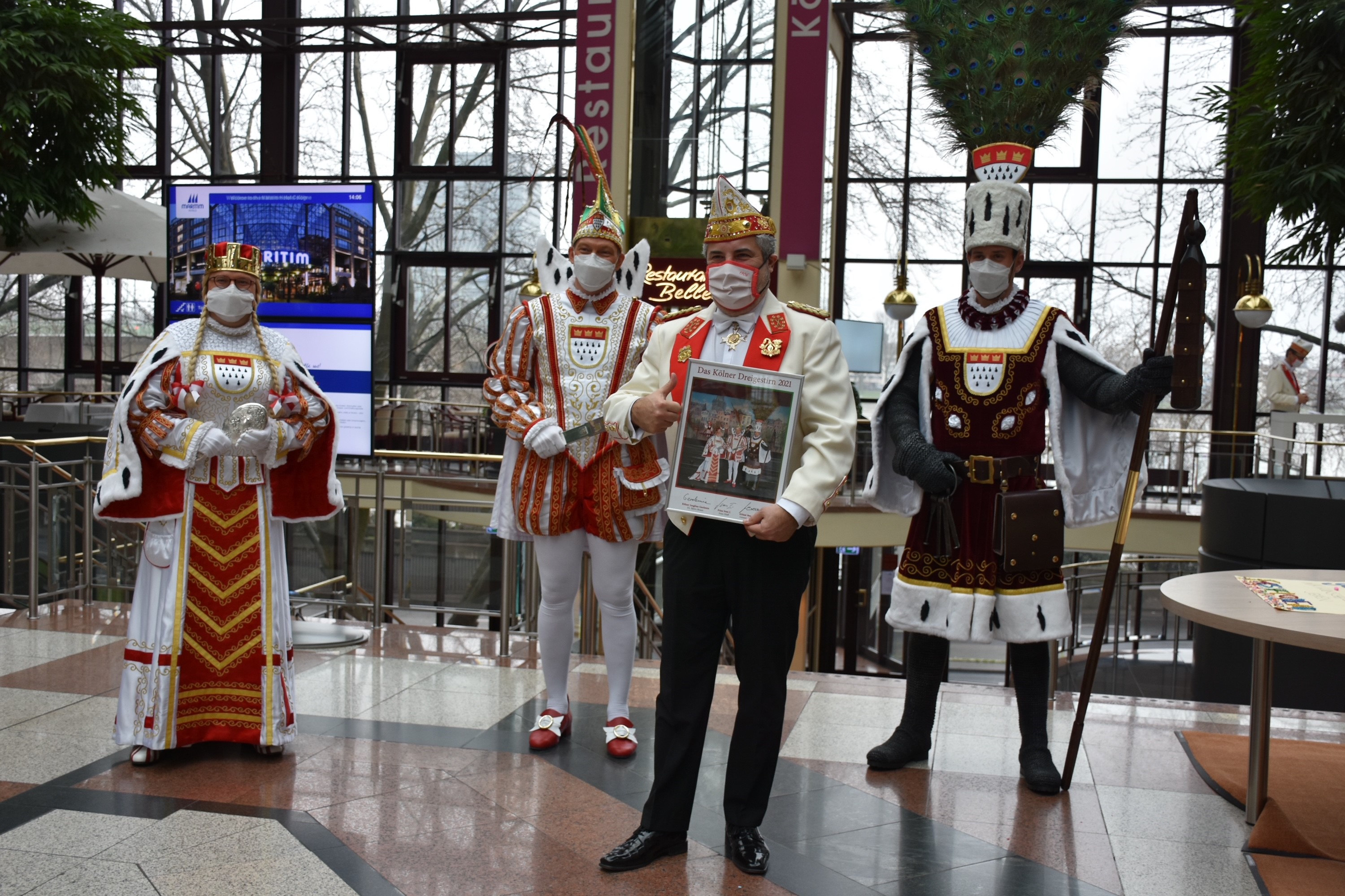Unter strengsten Corona-Maßnahmen (Test aller Teilnehmer vor Ort) durfte eine kleine Abordnung der Prinzen-Garde Köln das Kölner Dreigestirn 2021 im Hotel Maritim treffen. Hier überreichte unser Präsident Dino Massi eine Spende in Höhe von 1.111,11€ an Prinz Sven I. (Sven Oleff), Bauer Gereon (Gereon Glasemacher) und Jungfrau Gerdemie (Dr. Björn Braun). Das Kölner Dreigestirn sammelt in diesem Jahr Gelder für die TrauBe Köln e.V. Der Name steht für Trauer Begleitung für Kinder, Jugendliche und junge Erwachsene. Gerne beteiligte sich die Prinzen-Garde an dieser Aktion, denn als 11. Botschafter des Deutschen Kinderhospizvereins weiß sie sehr genau, wie dringend solche Spenden gebraucht werden.