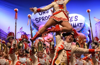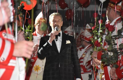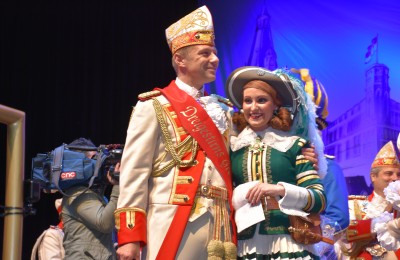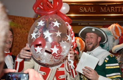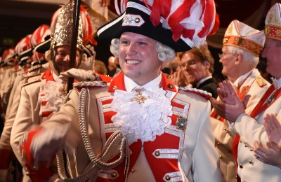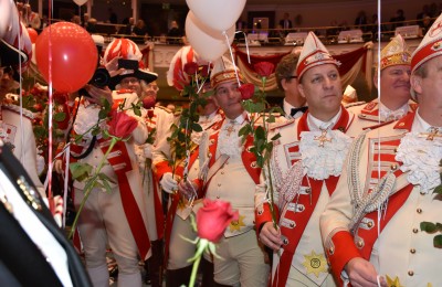 Nachdem die Räuber gegen 1:00 Uhr morgens die Bühne verlassen hatten war es soweit: Alle Tanzpaare, Präsident Dino Massi, Kommandant Marcel Kappestein, Sitzungsleiter Marcus Gottschalk, das Dreigestirn und die Familien von Tina und Alex kamen zum großen Finale auf die Bühne. Die Marketenderin Britta, von Jan van Werth, bedankte sich stellvertretend für alle Tanzpaare bei Tina und Alex für die wunderbare gemeinsame Zeit. Viele Korpskameraden, alle mit weiß-roten Luftballons und Rosen in der Hand, bildeten ein Spalier von der Bühne bis zum Eingang. Dort stand Norbert Conrads und sang den Klassiker „One moment in time“, welchen er etwas auf Tina und Alex umgeschrieben hatte. Als zum Schluss der Sitzung „Am Dom zu Kölle“ erklang und es Konfetti regnete, da war kein Halten mehr und die Tränen flossen reichlich.