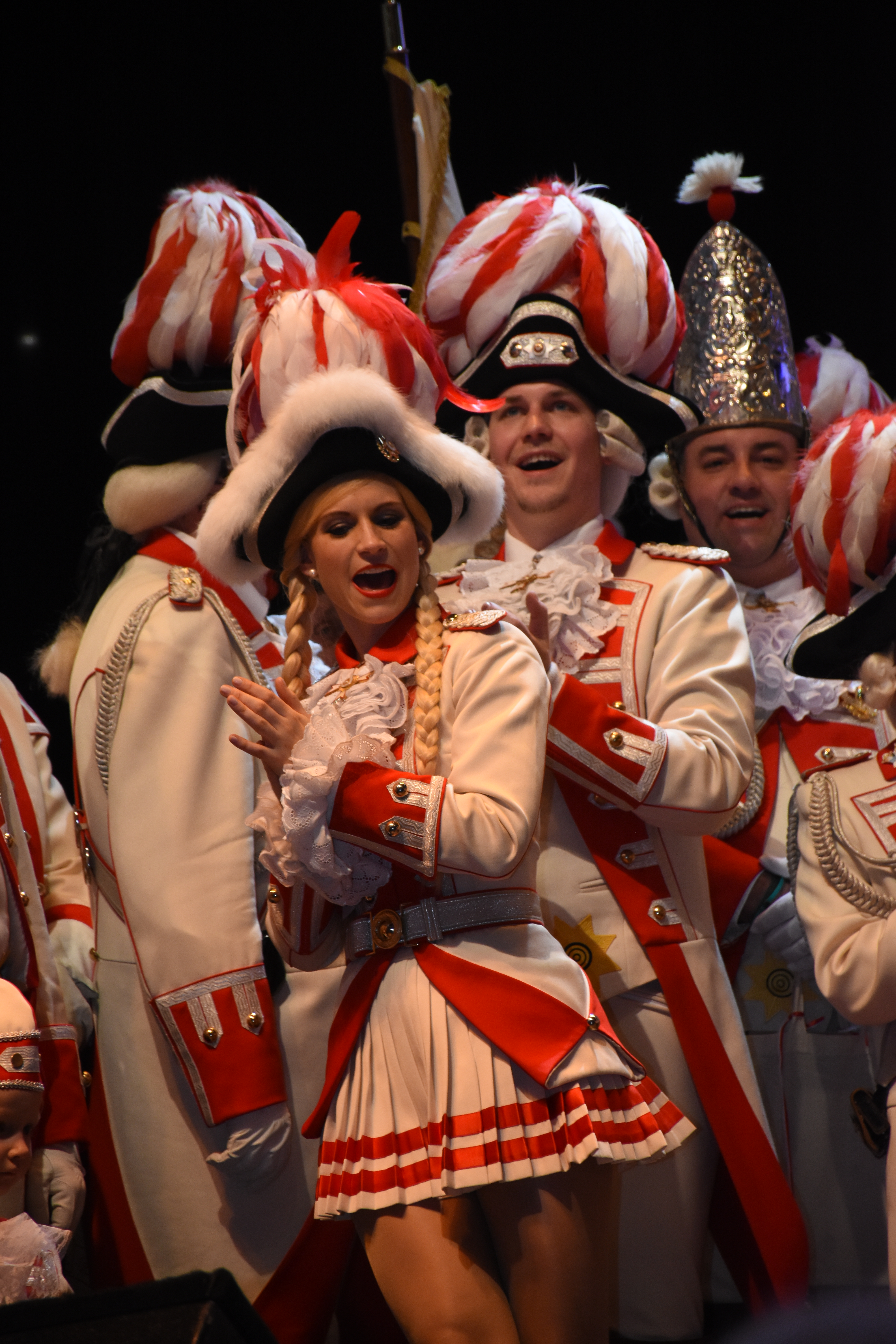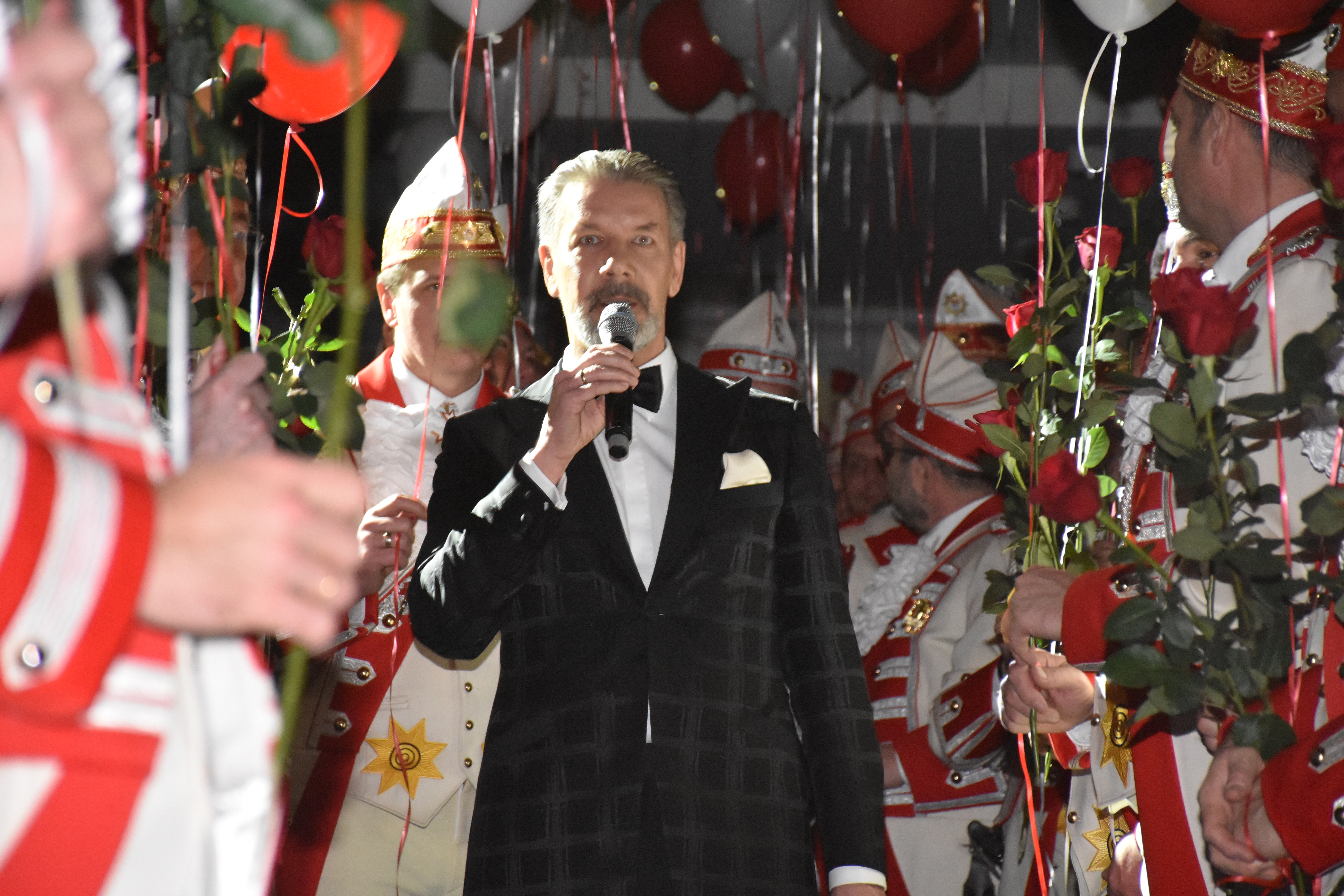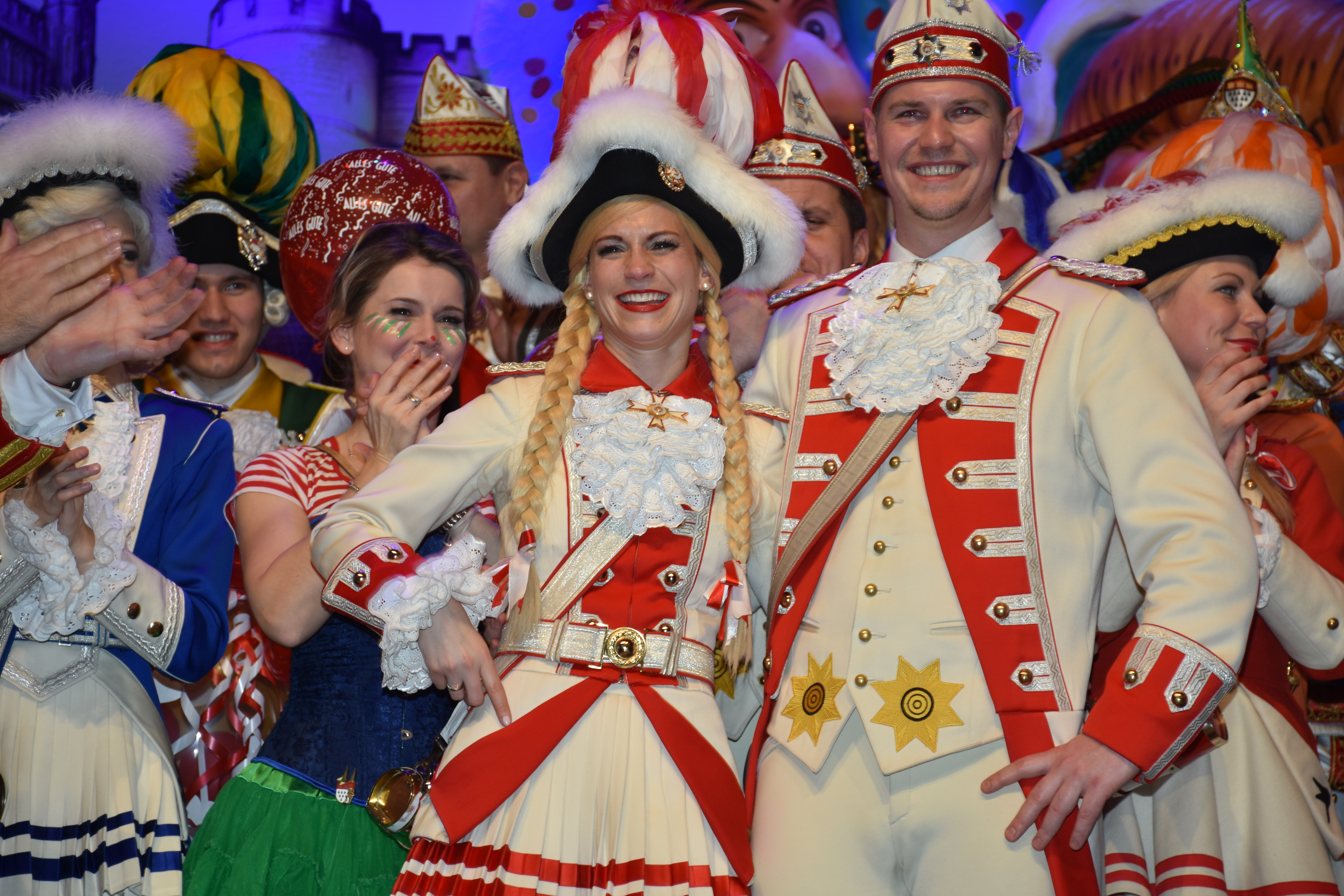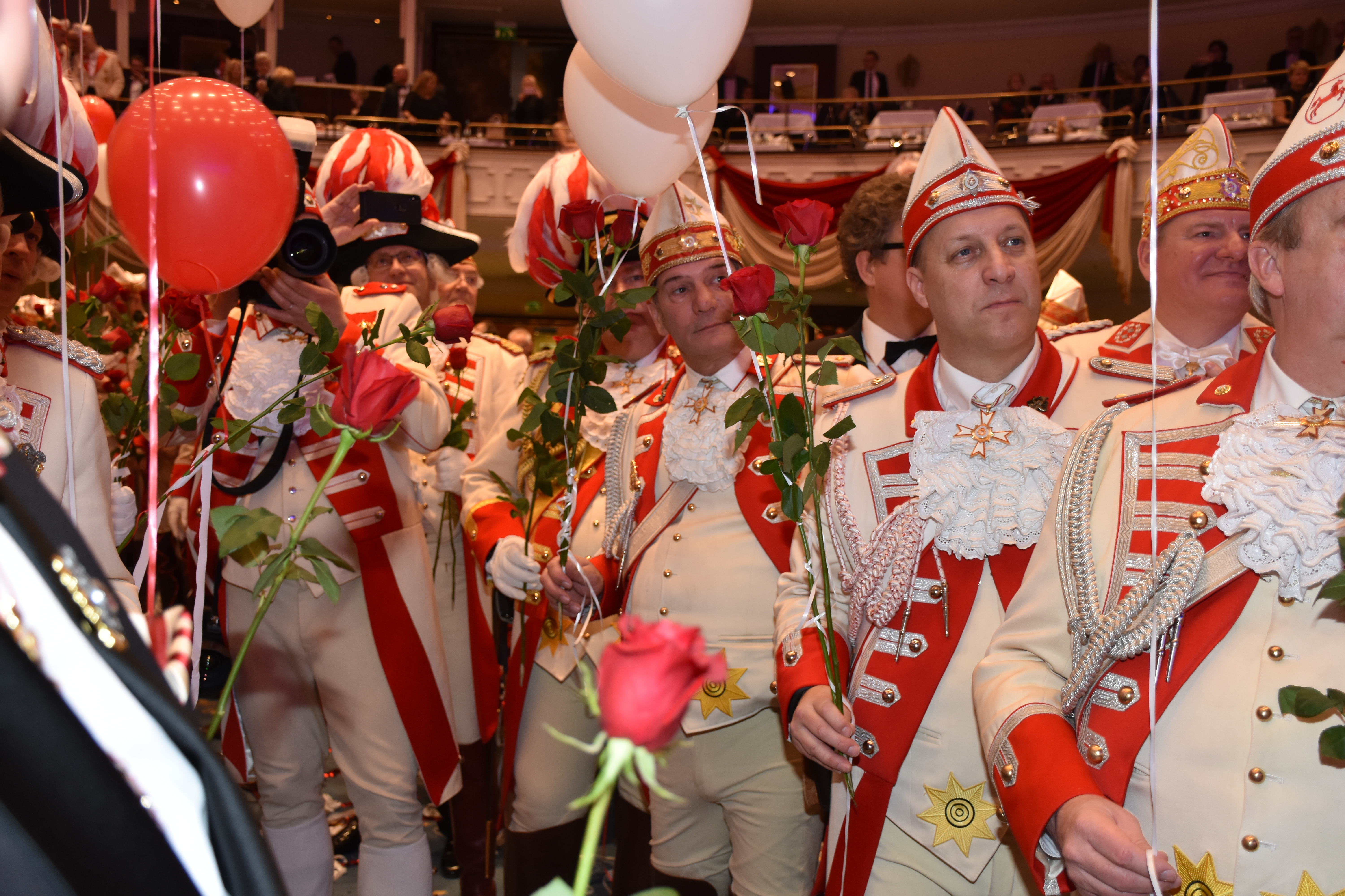 Nachdem die Räuber gegen 1:00 Uhr morgens die Bühne verlassen hatten war es soweit: Alle Tanzpaare, Präsident Dino Massi, Kommandant Marcel Kappestein, Sitzungsleiter Marcus Gottschalk, das Dreigestirn und die Familien von Tina und Alex kamen zum großen Finale auf die Bühne. Die Marketenderin Britta, von Jan van Werth, bedankte sich stellvertretend für alle Tanzpaare bei Tina und Alex für die wunderbare gemeinsame Zeit. Viele Korpskameraden, alle mit weiß-roten Luftballons und Rosen in der Hand, bildeten ein Spalier von der Bühne bis zum Eingang. Dort stand Norbert Conrads und sang den Klassiker „One moment in time“, welchen er etwas auf Tina und Alex umgeschrieben hatte. Als zum Schluss der Sitzung „Am Dom zu Kölle“ erklang und es Konfetti regnete, da war kein Halten mehr und die Tränen flossen reichlich.