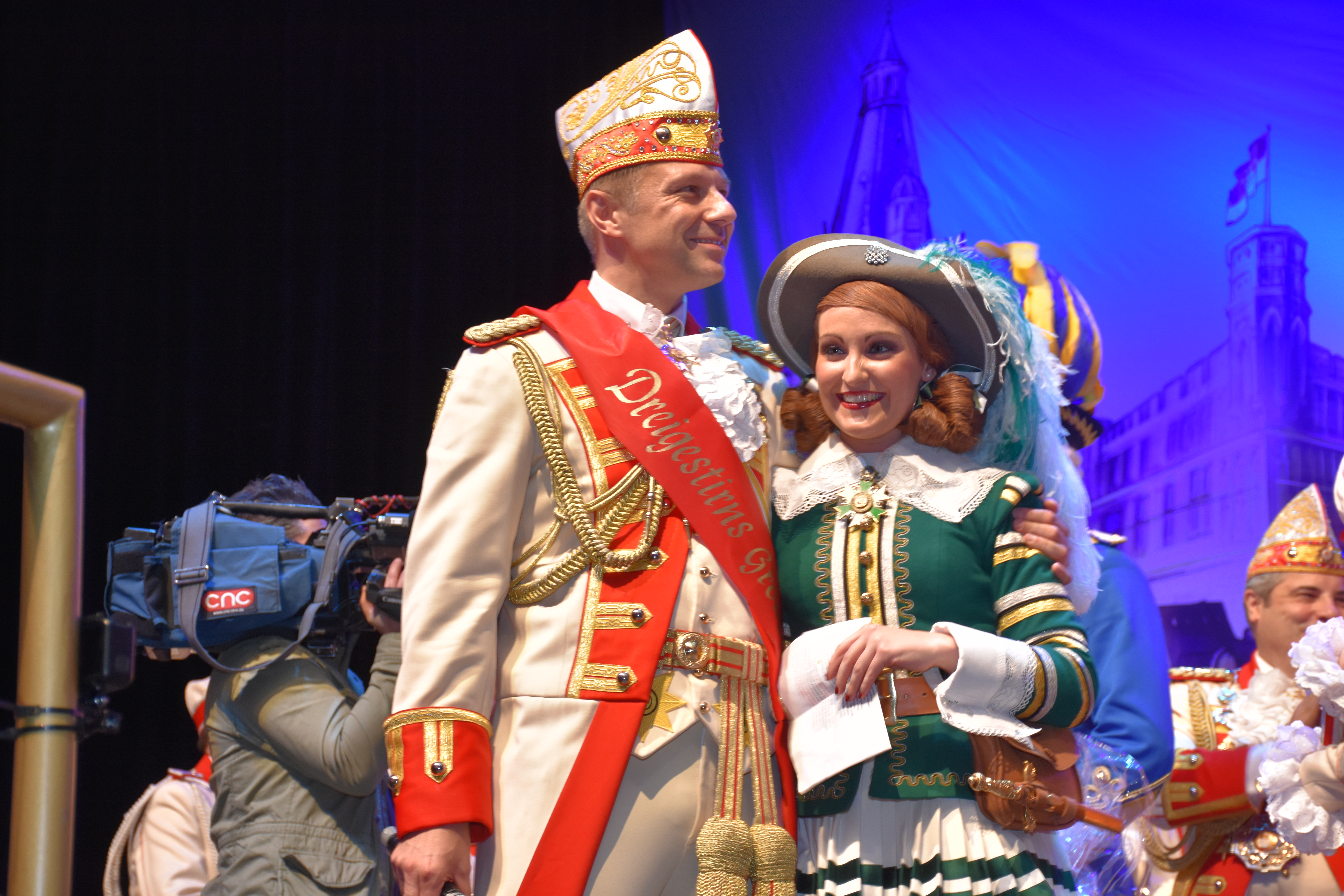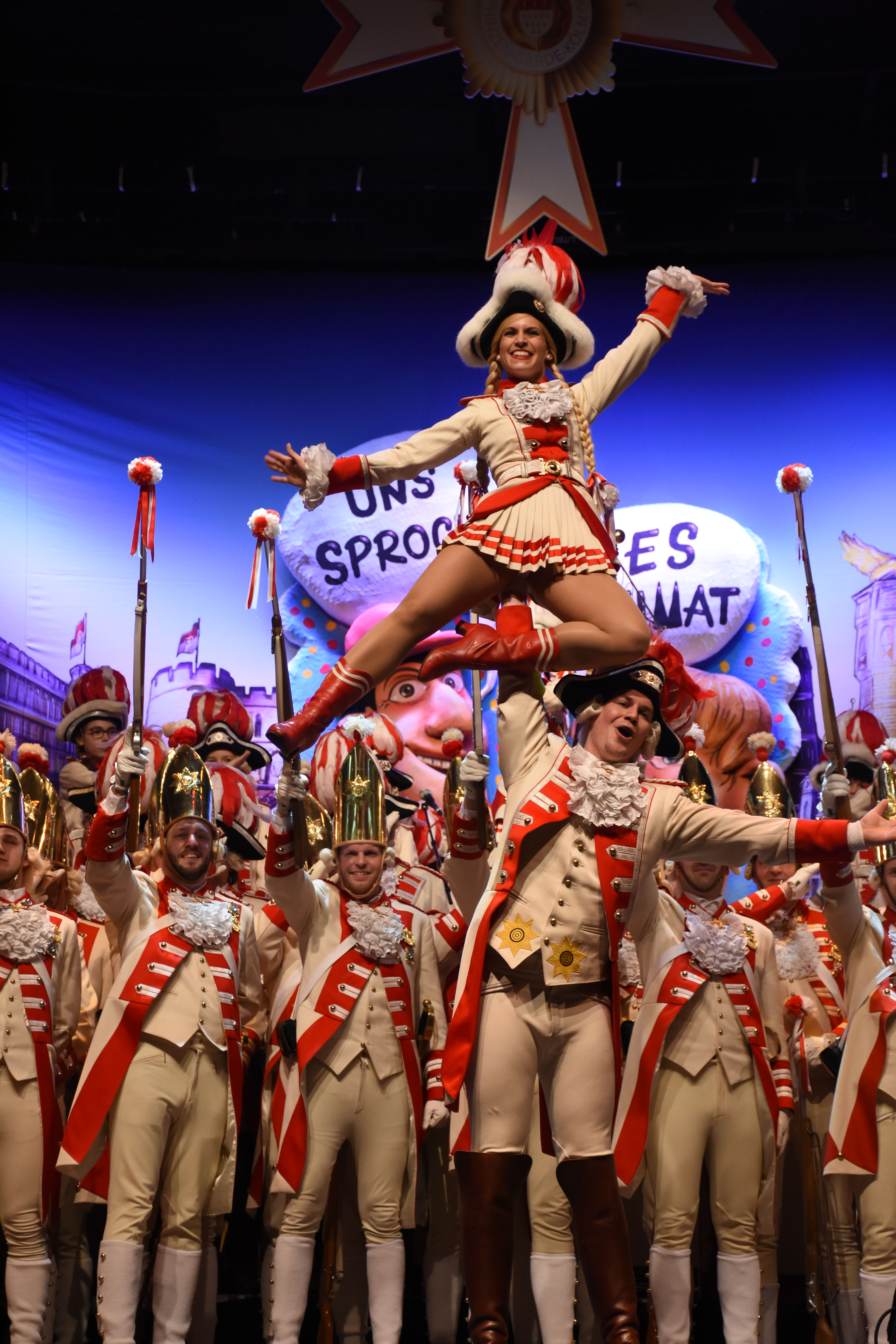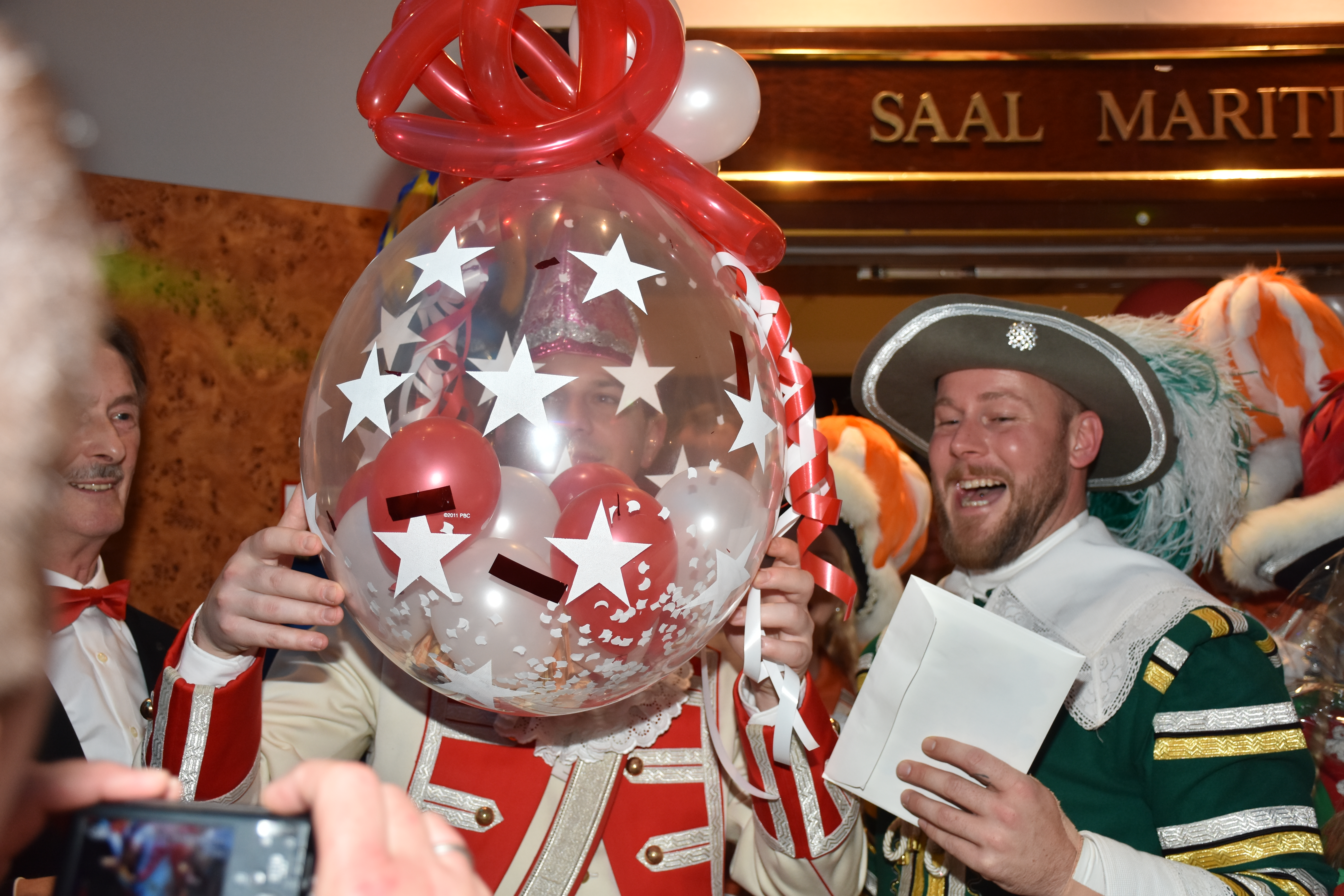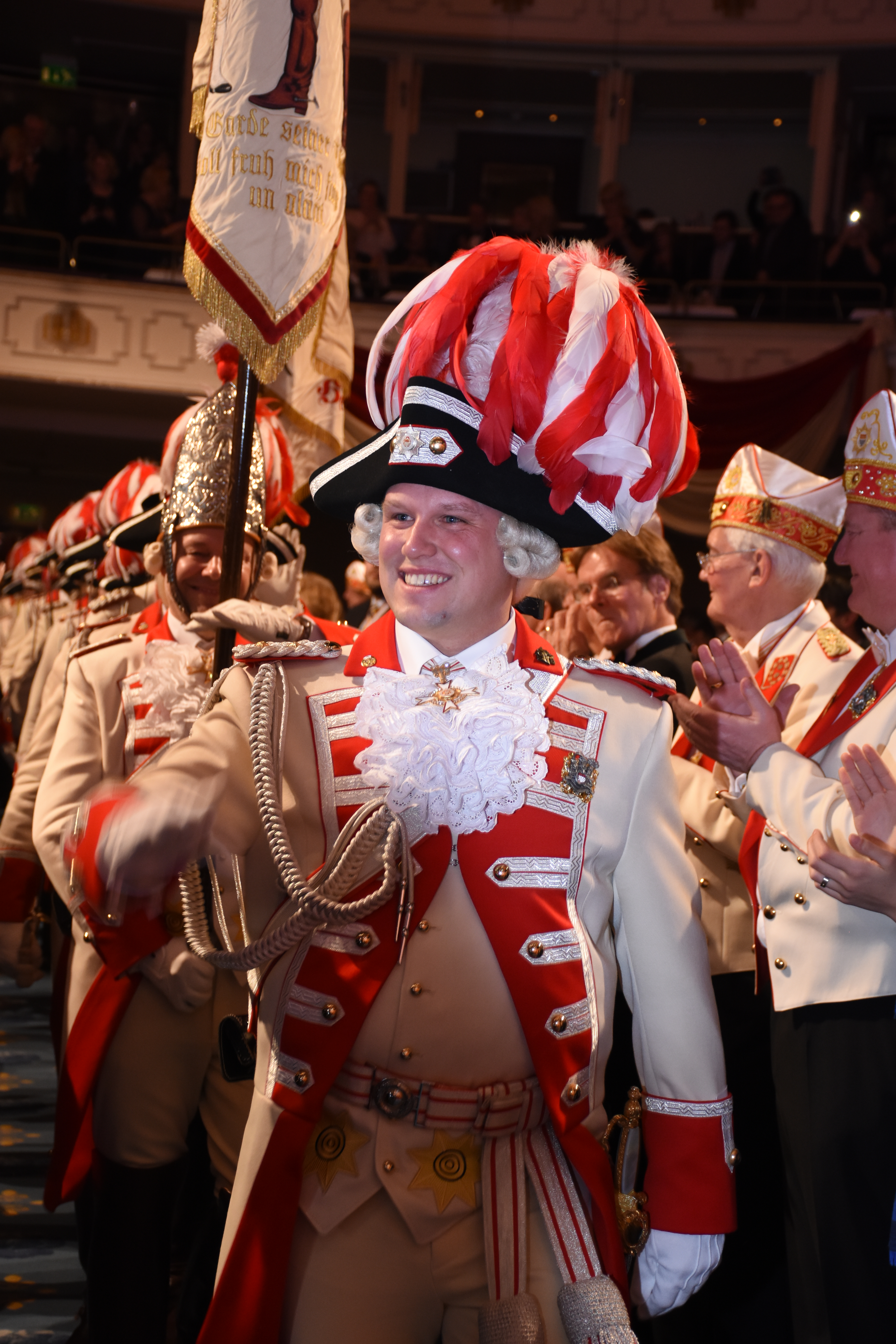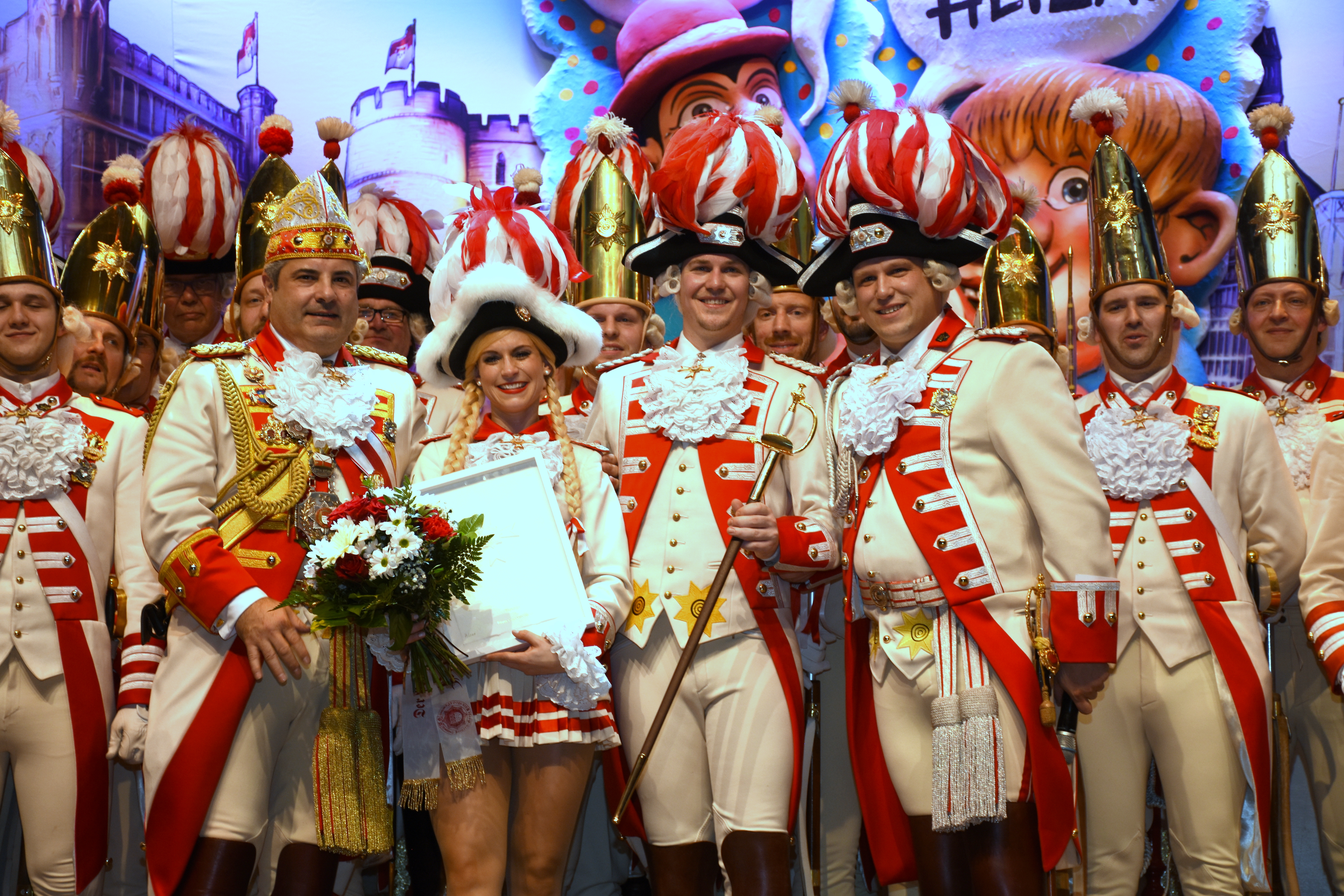Nachdem die Räuber gegen 1:00 Uhr morgens die Bühne verlassen hatten war es soweit: Alle Tanzpaare, Präsident Dino Massi, Kommandant Marcel Kappestein, Sitzungsleiter Marcus Gottschalk, das Dreigestirn und die Familien von Tina und Alex kamen zum großen Finale auf die Bühne. Die Marketenderin Britta, von Jan van Werth, bedankte sich stellvertretend für alle Tanzpaare bei Tina und Alex für die wunderbare gemeinsame Zeit. Viele Korpskameraden, alle mit weiß-roten Luftballons und Rosen in der Hand, bildeten ein Spalier von der Bühne bis zum Eingang. Dort stand Norbert Conrads und sang den Klassiker „One moment in time“, welchen er etwas auf Tina und Alex umgeschrieben hatte. Als zum Schluss der Sitzung „Am Dom zu Kölle“ erklang und es Konfetti regnete, da war kein Halten mehr und die Tränen flossen reichlich.