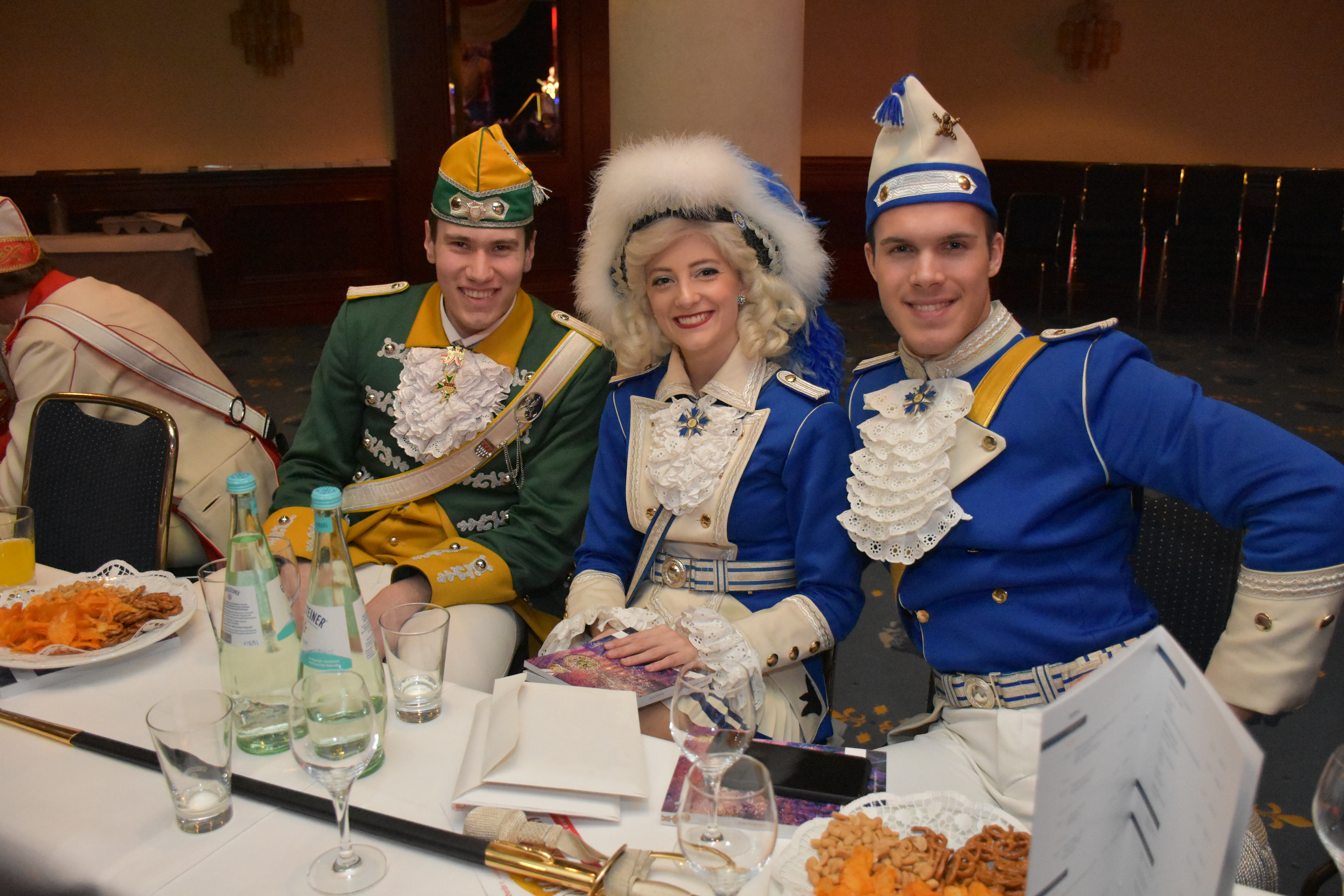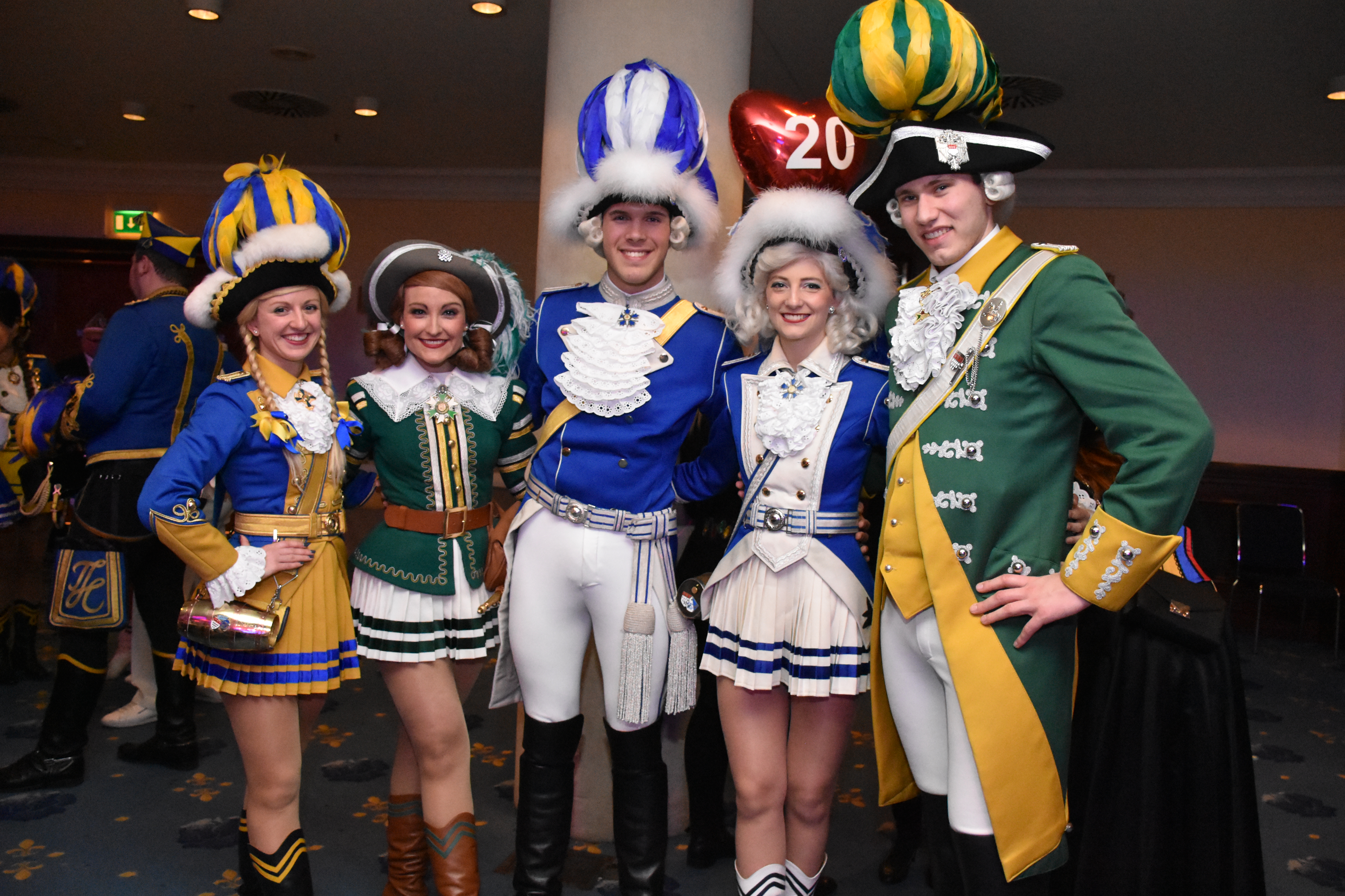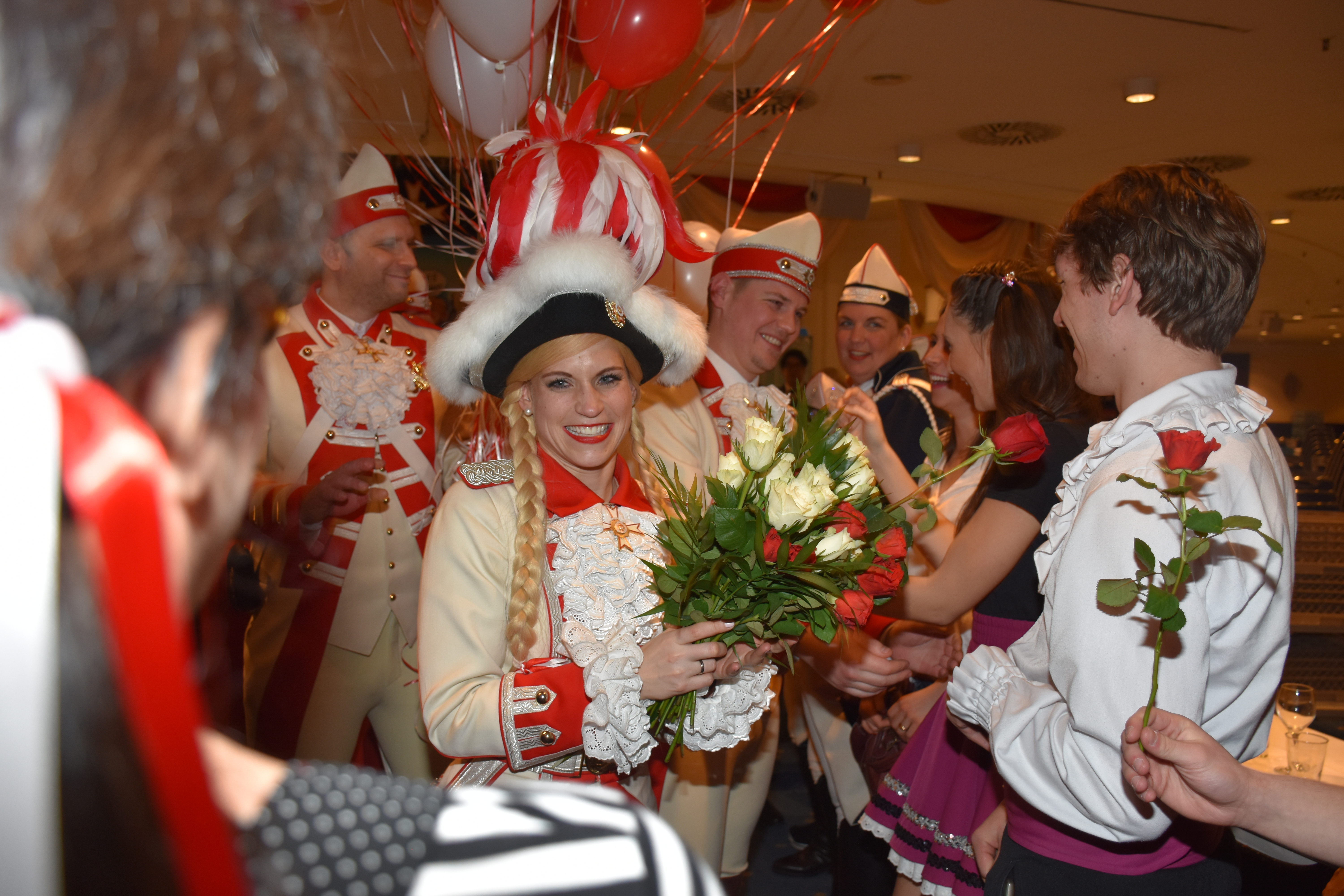 Als Tina und Alex mit dem Korps einzogen ahnten sie vielleicht, dass es heute etwas anders läuft als in den sieben Jahren zuvor. Und so war es dann auch. Nach dem „letzten Tanz“ durften beide im Elferrat Platz nehmen und die Sitzung verfolgen. Hier wurde es gegen Ende etwas voll, denn auch das Dreigestirn, diesmal begleitet von unserer Oberbürgermeisterin Henriette Reker in der Equipe, durfte sich nach ihrem Auftritt dort dazugesellen. Spätestens hier müssen sie etwas geahnt haben. Als sich dann nach und nach verschieden Tanzpaare aus anderen Gesellschaften an einem „abgelegenen Tisch“ trafen, war klar – hier passiert noch etwas Großes.