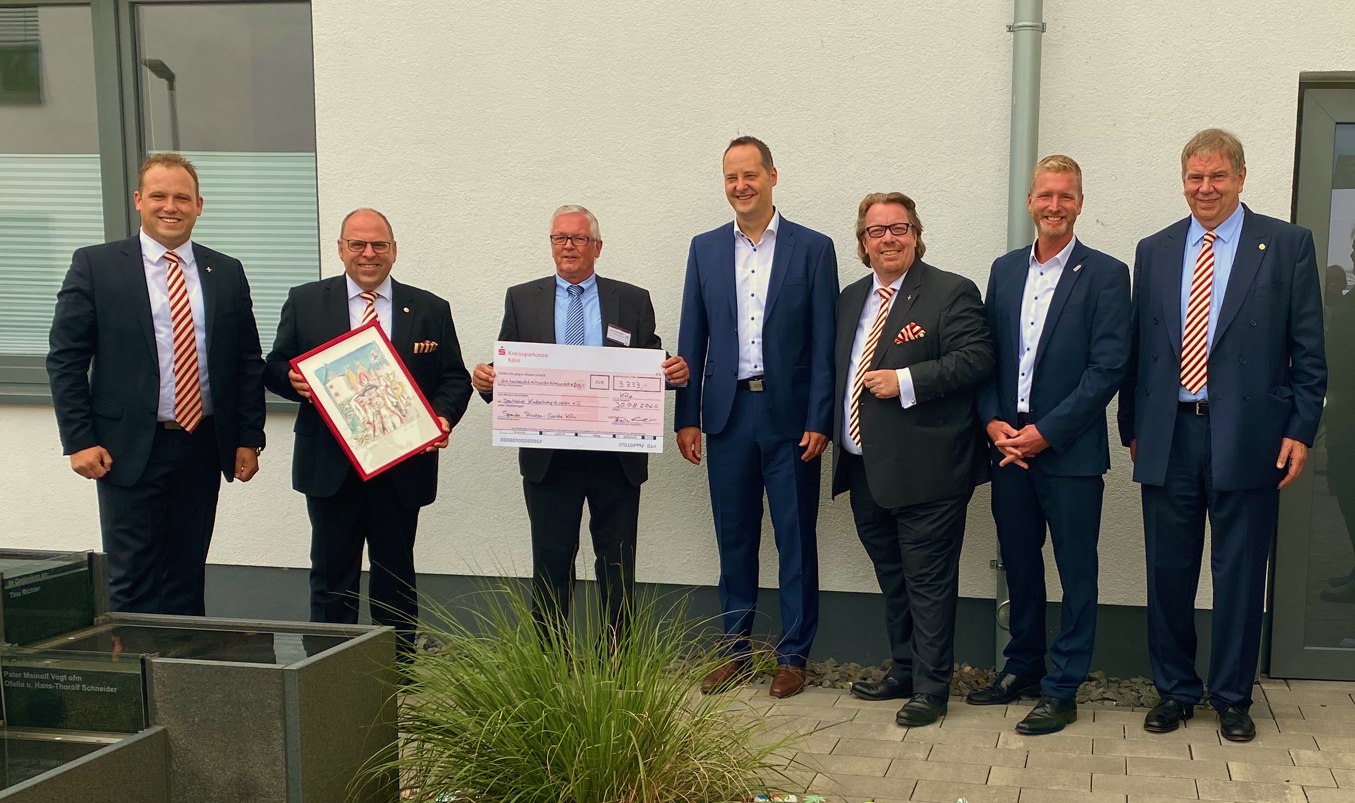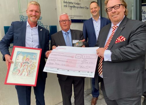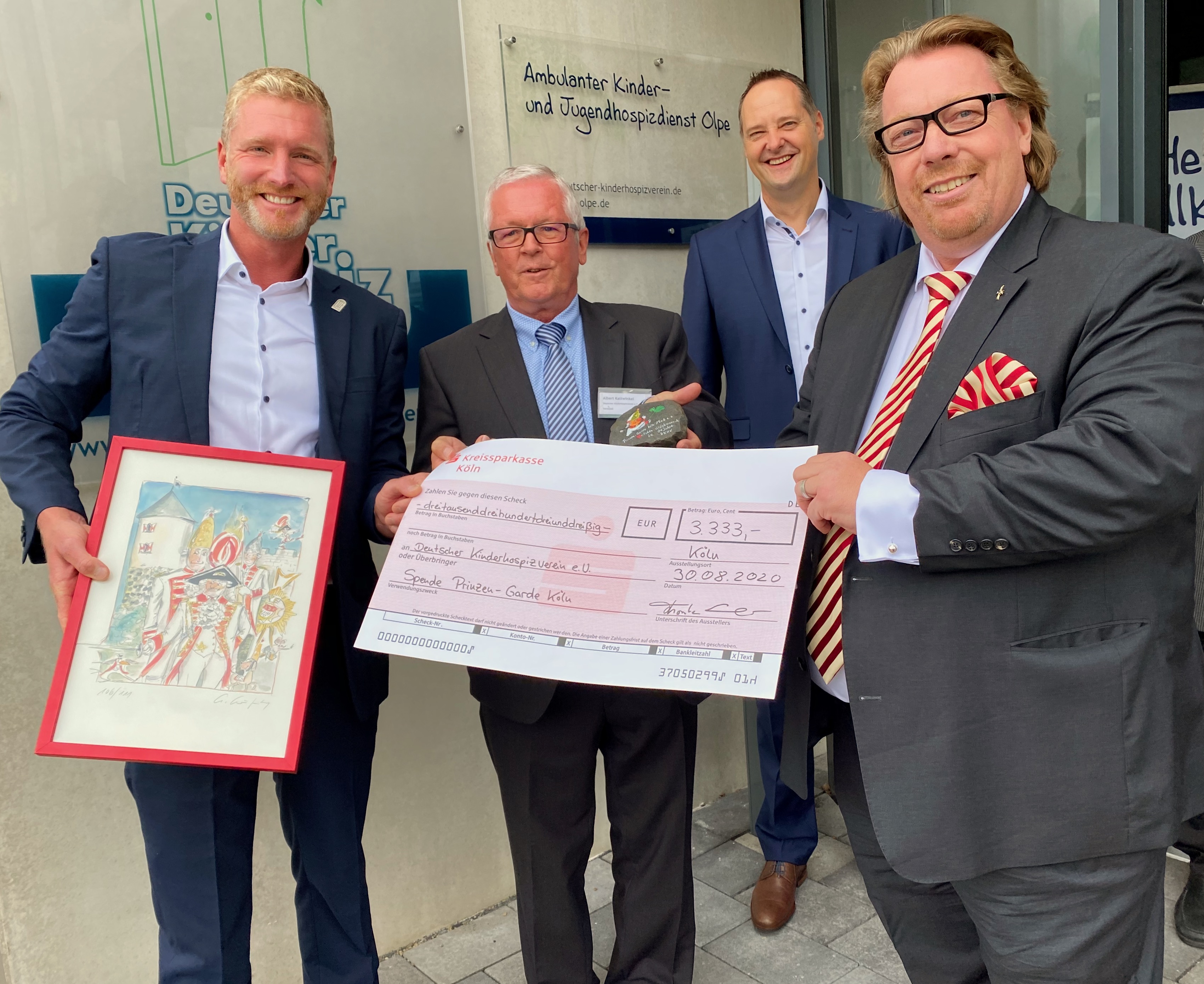 Kommandant Marcel Kappestein, Thorsten „Totti“ Schmidt, Franz-Bernd Daum und Andreas Garth übermittelten die Glückwünsche des Präsidenten Dino Massi und überreichten eine Karikatur von Gerda Laufenstein mit der Abbildung des Prinzen-Garde Turms und dreier Gardisten bekleidet mit Dreispitz, Gold- und Silberhelm. Marcel Kappestein hatte hierzu die laufende Nummer 106 der limitierten Auflage ausgewählt. Die 10 steht für den Tag der Deutschen Kinderhospizarbeit (10. Februar), die 6 für die sechs Gründerfamilien des am 10.2.1990 gegründeten Vereins. Für eine ganz besondere Überraschung sorgte der Corps à la Suite Führer Thorsten Schmidt. Im Kreise seiner Kameraden wurde zur Unterstützung der lobenswerten ehrenamtlichen Arbeit des Kinderhospizvereins aufgerufen und so durfte Albert Kattwinkel (Geschäftsführender Vorstand) einen Spendenscheck in Höhe von 3.333€ aus seinen Händen entgegen nehmen.