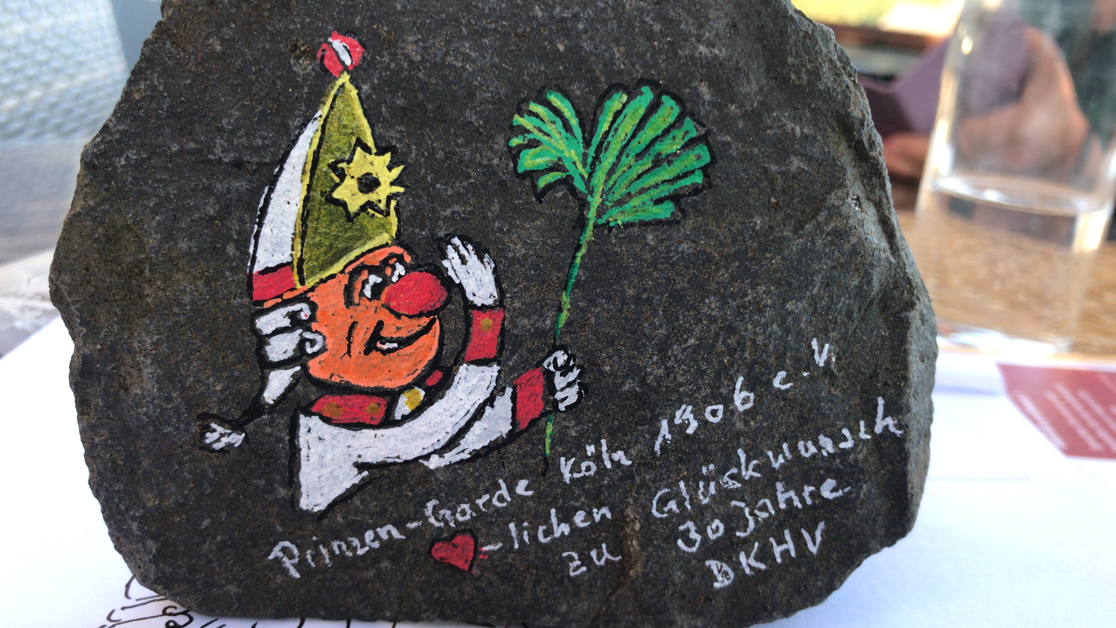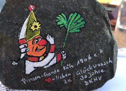 Bemalte Steine als Zeichen der Verbindung, spielten an diesem Tag eine besondere Rolle, hatte man doch zu einem Steinmarathon aufgerufen. Ein Prinzen-Gardist, der das Symbol des Kinderhospizdienstes in Form eines Ginkoblattes in der Hand hält, wurde von Andreas Garth angefertigt und verschönert nun neben hunderten von bunten Steinen die Gartenanlagen rund um die Geschäftsstelle in Olpe. „Wenn ihr uns braucht, dann sind wir da!“, so lautete die Botschaft des Kommandanten, die mit großem Applaus und Dank belohnt wurde.