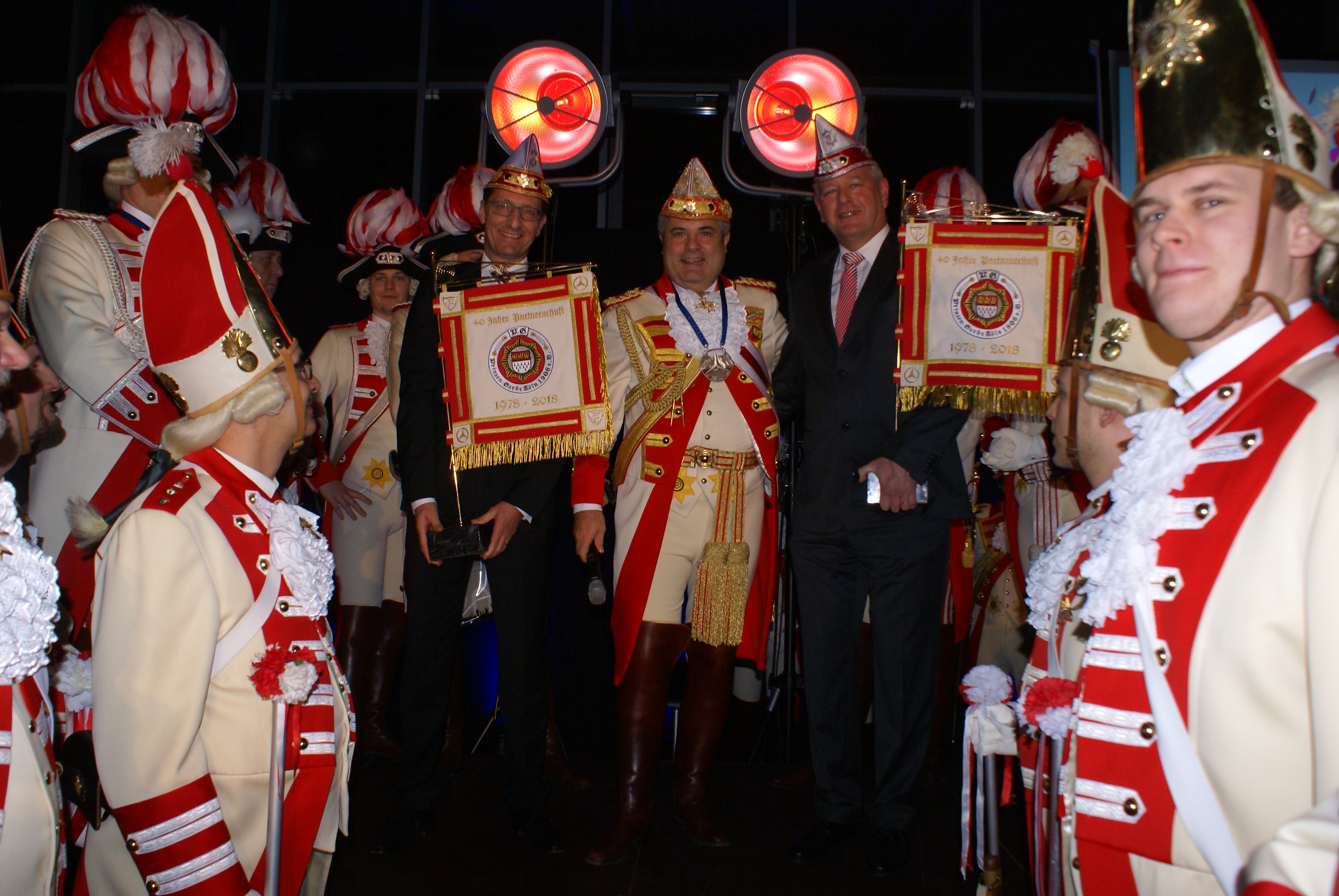 Da kam selbst Vertriebsdirektor Thomas Millies ins Schwärmen, dass das Erscheinungsbild der sonst mit hochwertigen Nutzfahrzeugen gut ausgestatteten Wagenhalle noch getoppt werden konnte. Aber der Anlass war auch ein besonderer. Zum vierzigsten Mal durfte die Prinzen-Garde Köln „ihre Mercedes-Flotte“ übernehmen und kann jetzt damit sicher kreuz und quer durch Köln zu ihren Aufzügen fahren. Präsident Dino Massi dankte den Vertriebsdirektoren Thomas Millies und Matthias Hindemith für diese lang anhaltende Großzügigkeit. Als kleines Dankeschön bekam jeder eine Standarte mit Prinzen-Garde Logo und der gestickten Aufschrift „40 Jahre Partnerschaft (1978-2018)“ geschenkt. Dann spielte unser Regimentsspielamannszug flotte Lieder zum Mitsingen und Schunkeln und unser Tanzpaar Tina und Alexander zeigte zusammen mit den Kameraden den Fußkorpstanz. Als Überraschungsgast des Abends kam Bernd Stelter auf die Bühne und sorgt mit seinem gelungenen Vortrag für gute Unterhaltung.