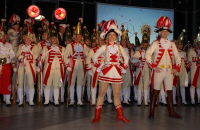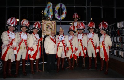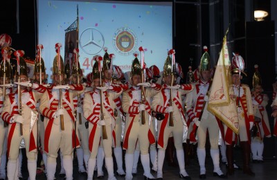 Was für ein Bild, die Prinzen-Garde Köln in voller Mannschaftsstärke mit Vorstand und Spielmannszug auf der Bühne der Mercedes Benz AG in Frechen.