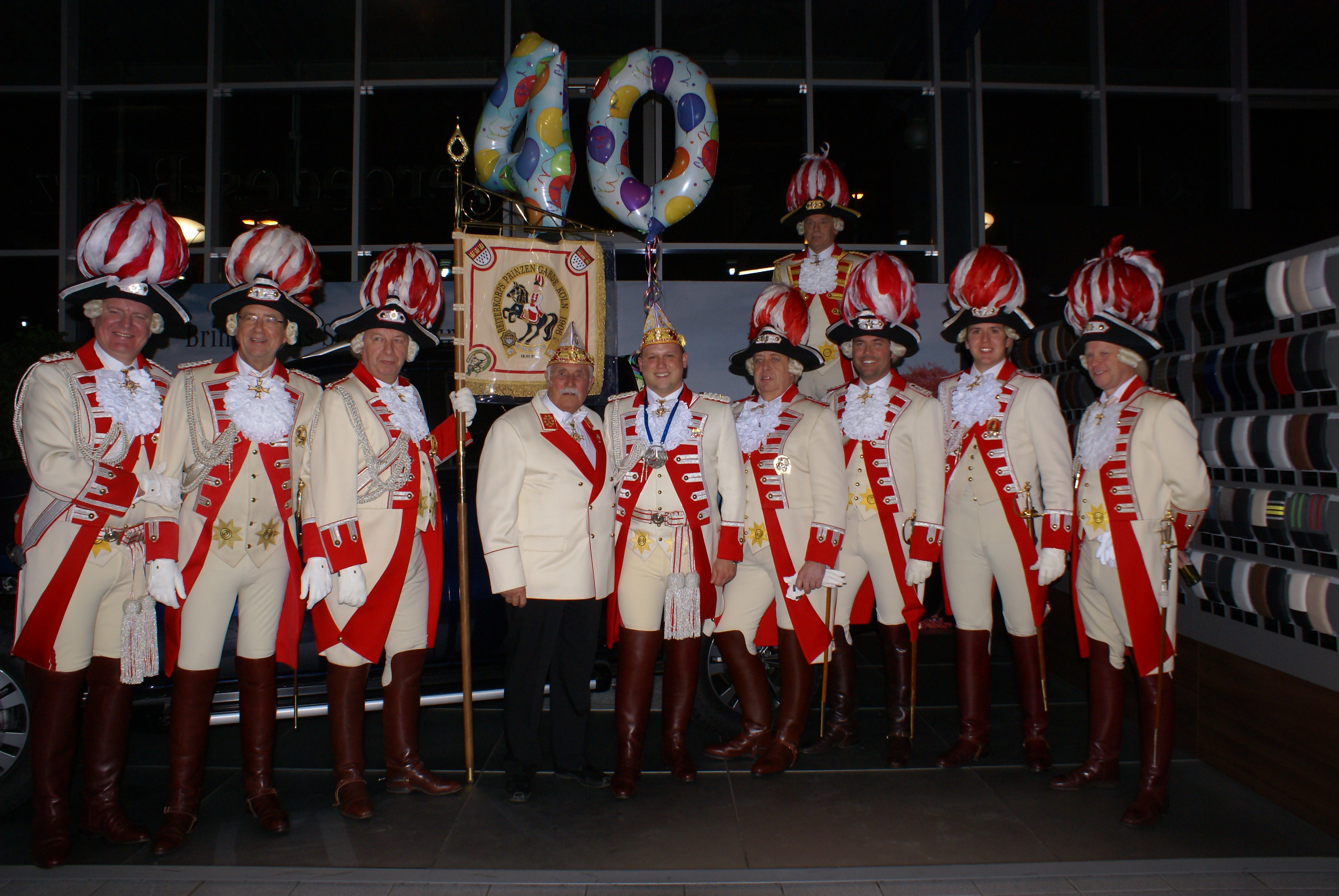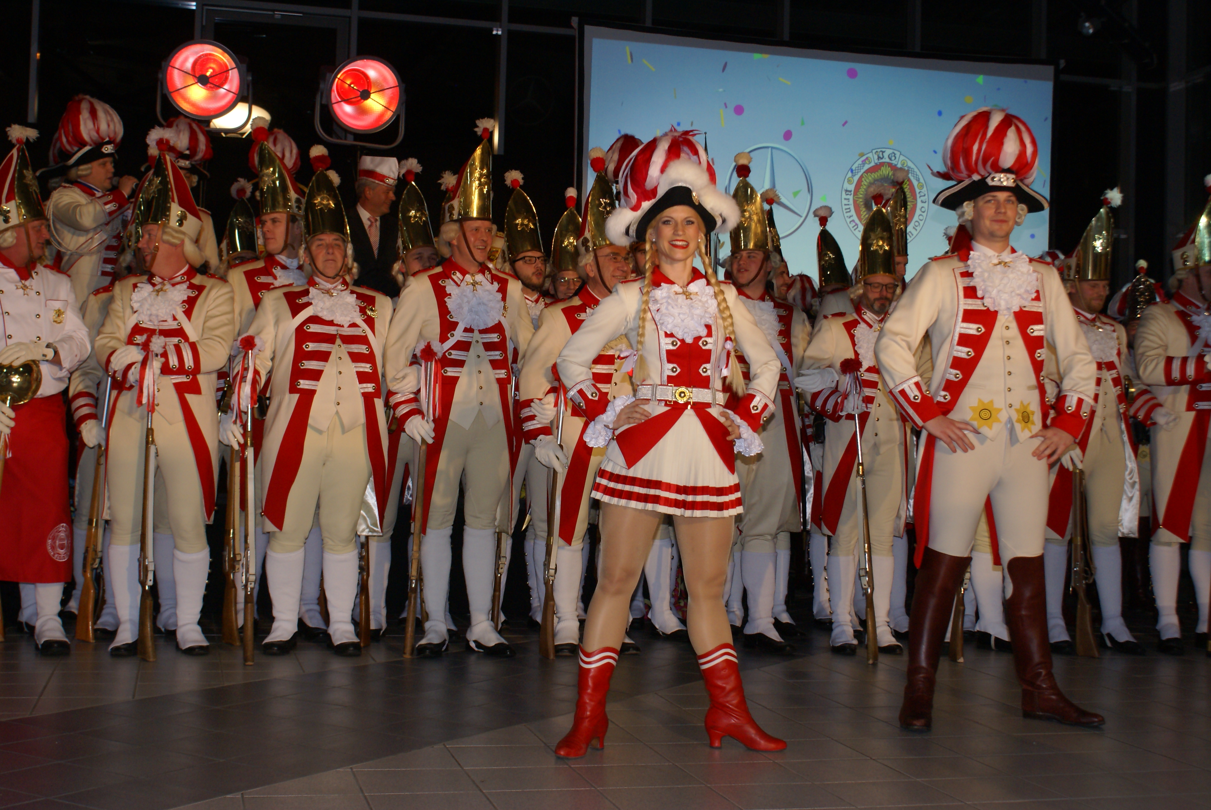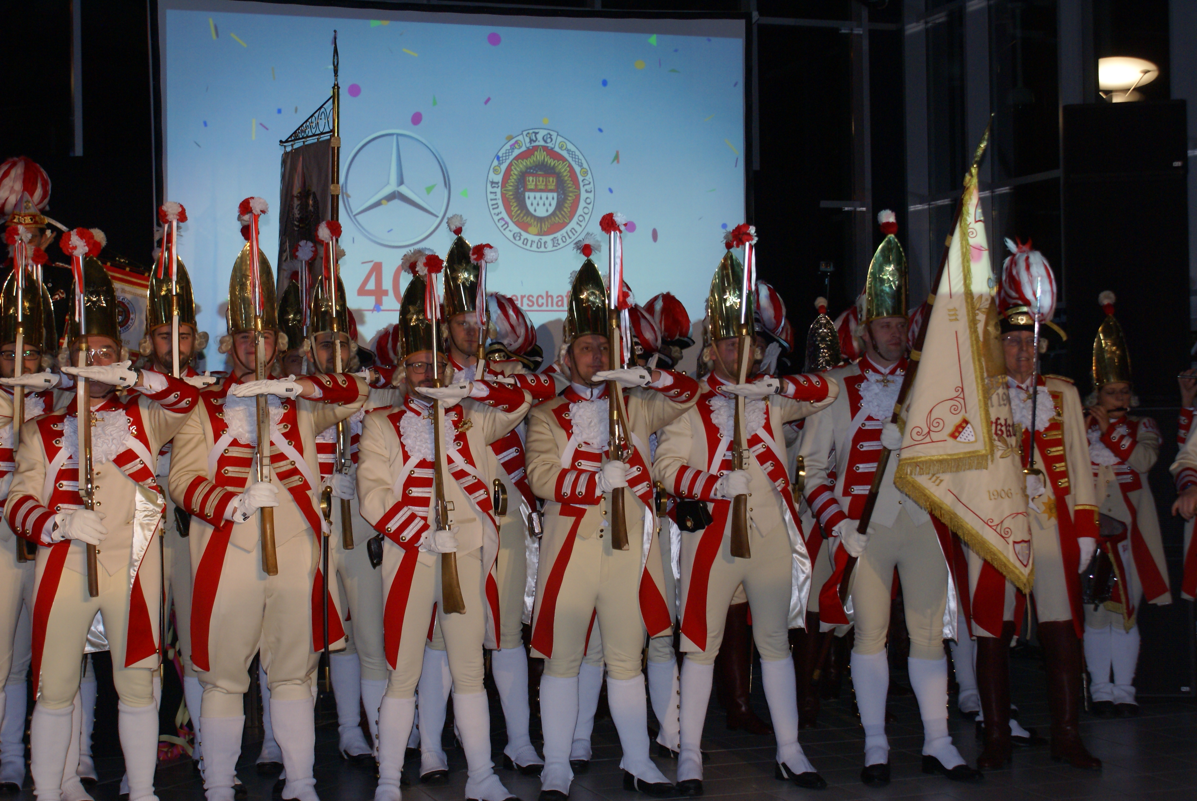 Was für ein Bild, die Prinzen-Garde Köln in voller Mannschaftsstärke mit Vorstand und Spielmannszug auf der Bühne der Mercedes Benz AG in Frechen.