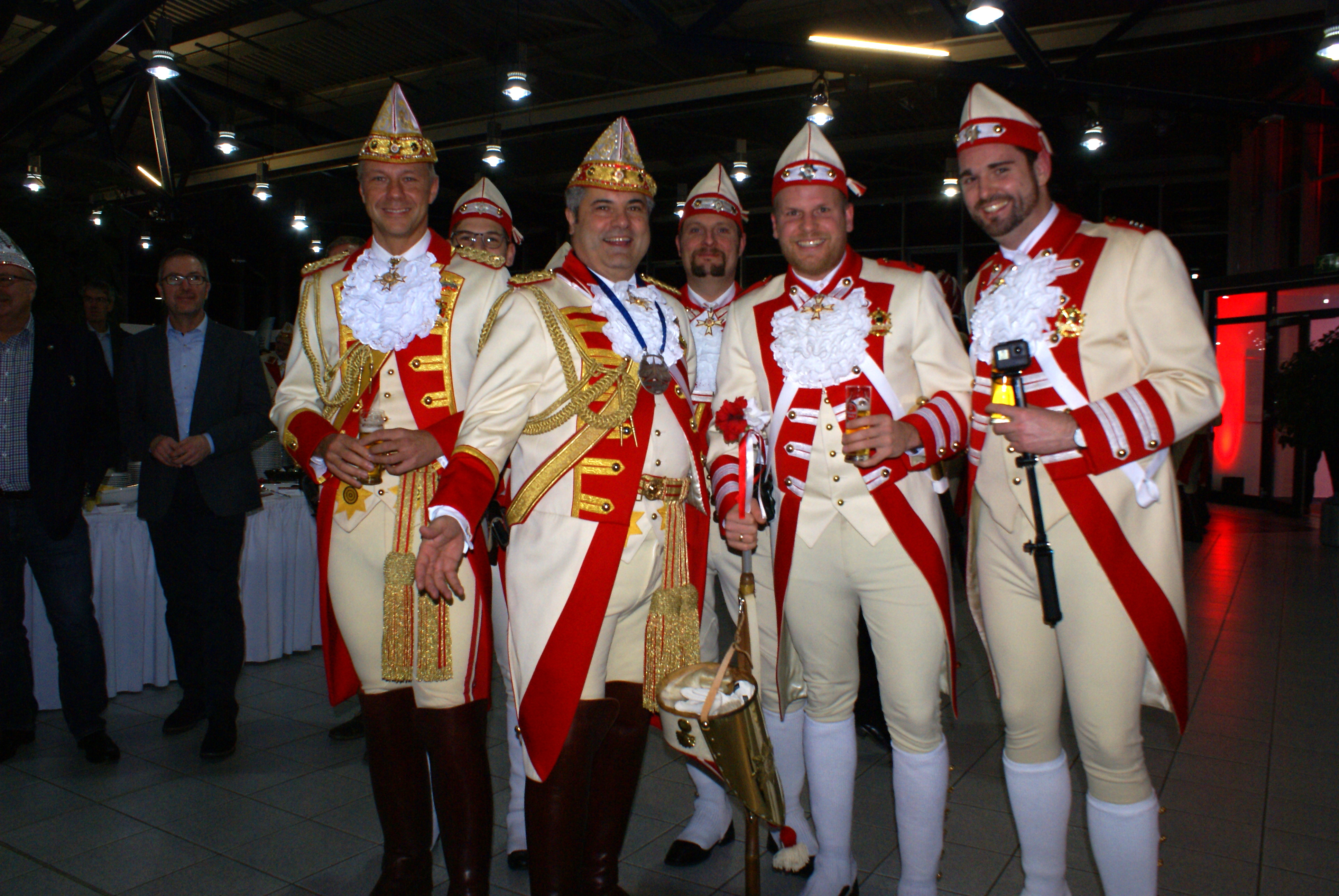 Da kam selbst Vertriebsdirektor Thomas Millies ins Schwärmen, dass das Erscheinungsbild der sonst mit hochwertigen Nutzfahrzeugen gut ausgestatteten Wagenhalle noch getoppt werden konnte. Aber der Anlass war auch ein besonderer. Zum vierzigsten Mal durfte die Prinzen-Garde Köln „ihre Mercedes-Flotte“ übernehmen und kann jetzt damit sicher kreuz und quer durch Köln zu ihren Aufzügen fahren. Präsident Dino Massi dankte den Vertriebsdirektoren Thomas Millies und Matthias Hindemith für diese lang anhaltende Großzügigkeit. Als kleines Dankeschön bekam jeder eine Standarte mit Prinzen-Garde Logo und der gestickten Aufschrift „40 Jahre Partnerschaft (1978-2018)“ geschenkt. Dann spielte unser Regimentsspielamannszug flotte Lieder zum Mitsingen und Schunkeln und unser Tanzpaar Tina und Alexander zeigte zusammen mit den Kameraden den Fußkorpstanz. Als Überraschungsgast des Abends kam Bernd Stelter auf die Bühne und sorgt mit seinem gelungenen Vortrag für gute Unterhaltung.