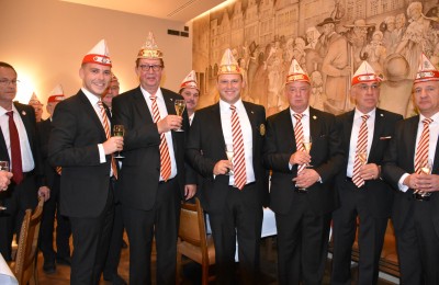 Zum Standardprogramm im Reservekorps gehört: Frühstück im Bus und etwas zu trinken gegen das Heimweh. Das haben die 26 Korpskameraden auch bei dieser Fahrt wieder gut angenommen. Unser Stadthotel in Münster lag sehr zentral, von daher gab es meist nur kurze Wege zu den verschiedenen Sehenswürdigkeiten. Gleich das erste Highlight war der Empfang im Friedenssaal des Rathauses durch Bürgermeister Herrn Joksch. Hier in diesem Saal wurde 1648 der Westfälische Frieden besiegelt. Reservekorpsführer Jürgen Wicharz bedankte sich beim Bürgermeister für den freundlichen Empfang und natürlich gab es als Gastgeschenk den Sessionsorden der PG. Und am Abend mal in einen Wasch Salon gehen? Warum eigentlich nicht. Das unterhaltsame Programm „Wasch Salon“ und ein drei Gänge Menü wartete im Varietee GOP auf die noch hellwachen Korpskameraden.
