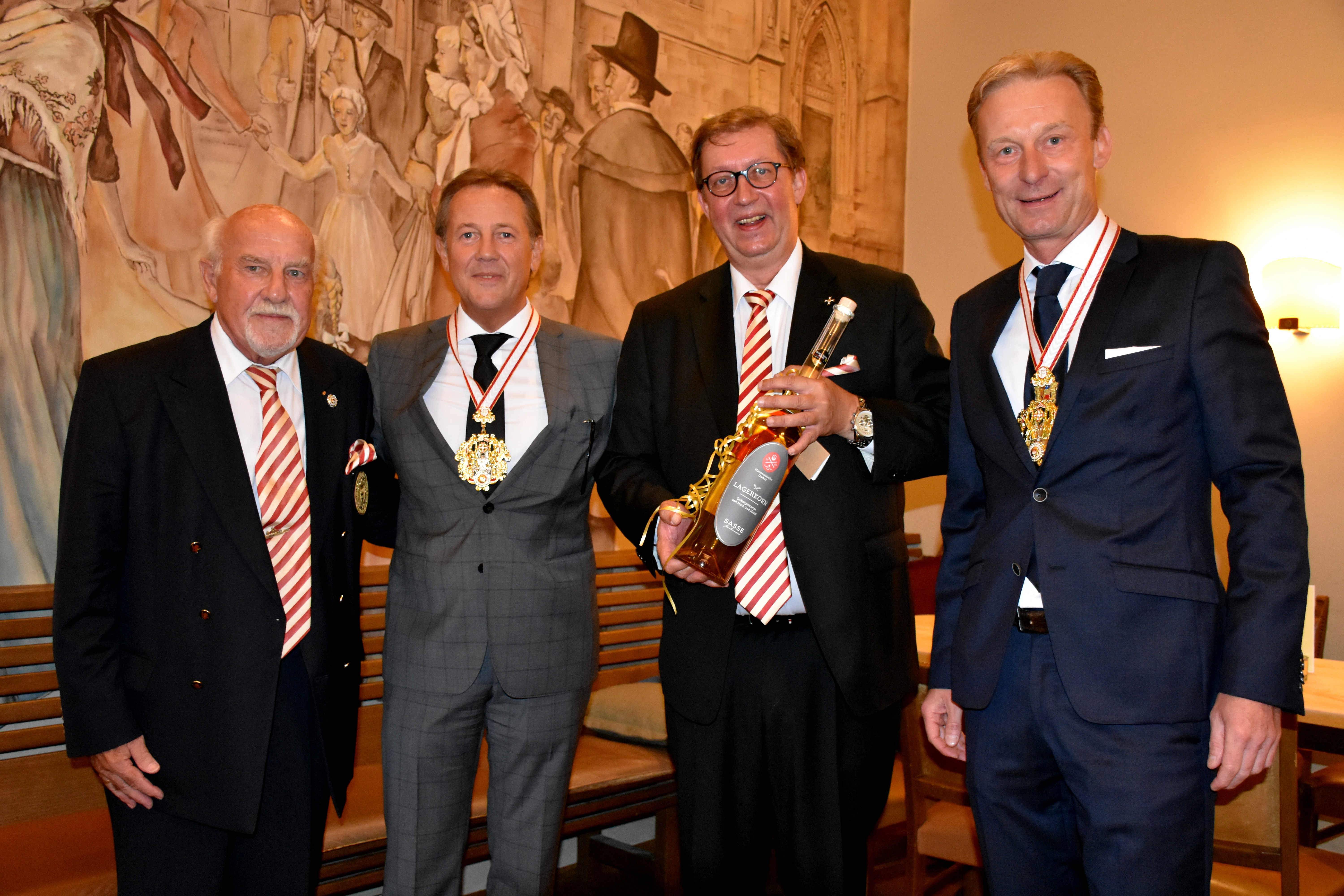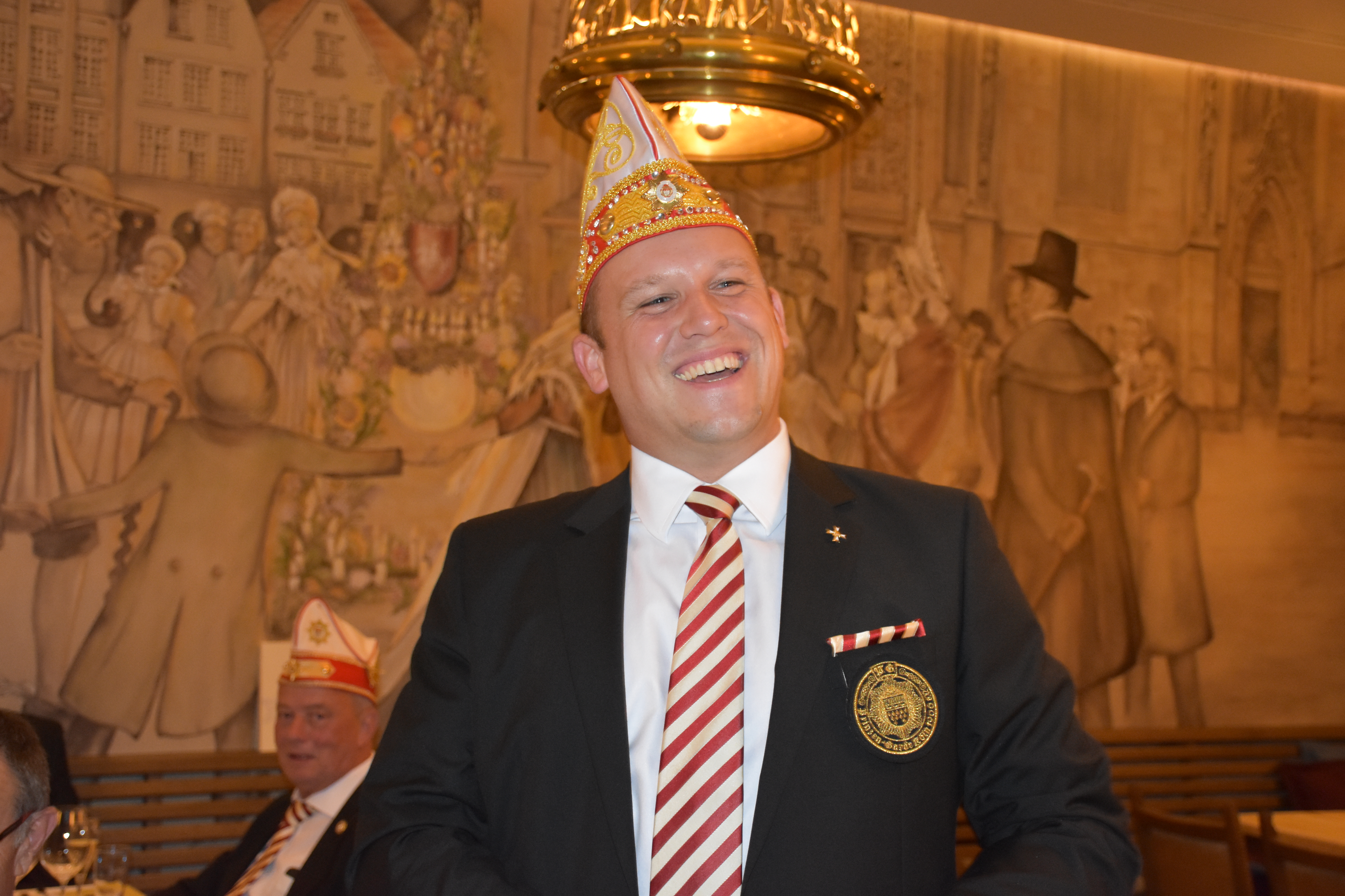 Tag zwei begann mit einer Stadtführung durch den historischen Kern von Münster. Zur Unterstützung der Tour haben sich an diesem Tag noch unser Kommandant Marcel Kappestein und Literat Dennis Hille dazugesellt. Am Nachmittag noch eine Bootsfahrt mit allen Mann auf dem Aasee, dann etwas Freizeit, bevor es am Abend richtig feierlich wurde. Im Lambertuszimmer des historischen Gasthauses „Stuhlmacher“ fand unser Galadinner statt. Jürgen Wicharz begrüßte seine Korpskameraden und zwei Vertreter der Prinzengarde Münster sehr herzlich zu dem Dinner. Draußen beim Stadtfest sang Jan Delay seine Songs und drinnen bei uns trug der Kiepenkerl seine Lieder und kleine Geschichten vor. Mehr Kontrastprogramm geht nicht und beide sind gut angekommen. Zum Abschluss des Tages der Klassiker: Ein Absacker an der Hotelbar bis tief in die Nacht.