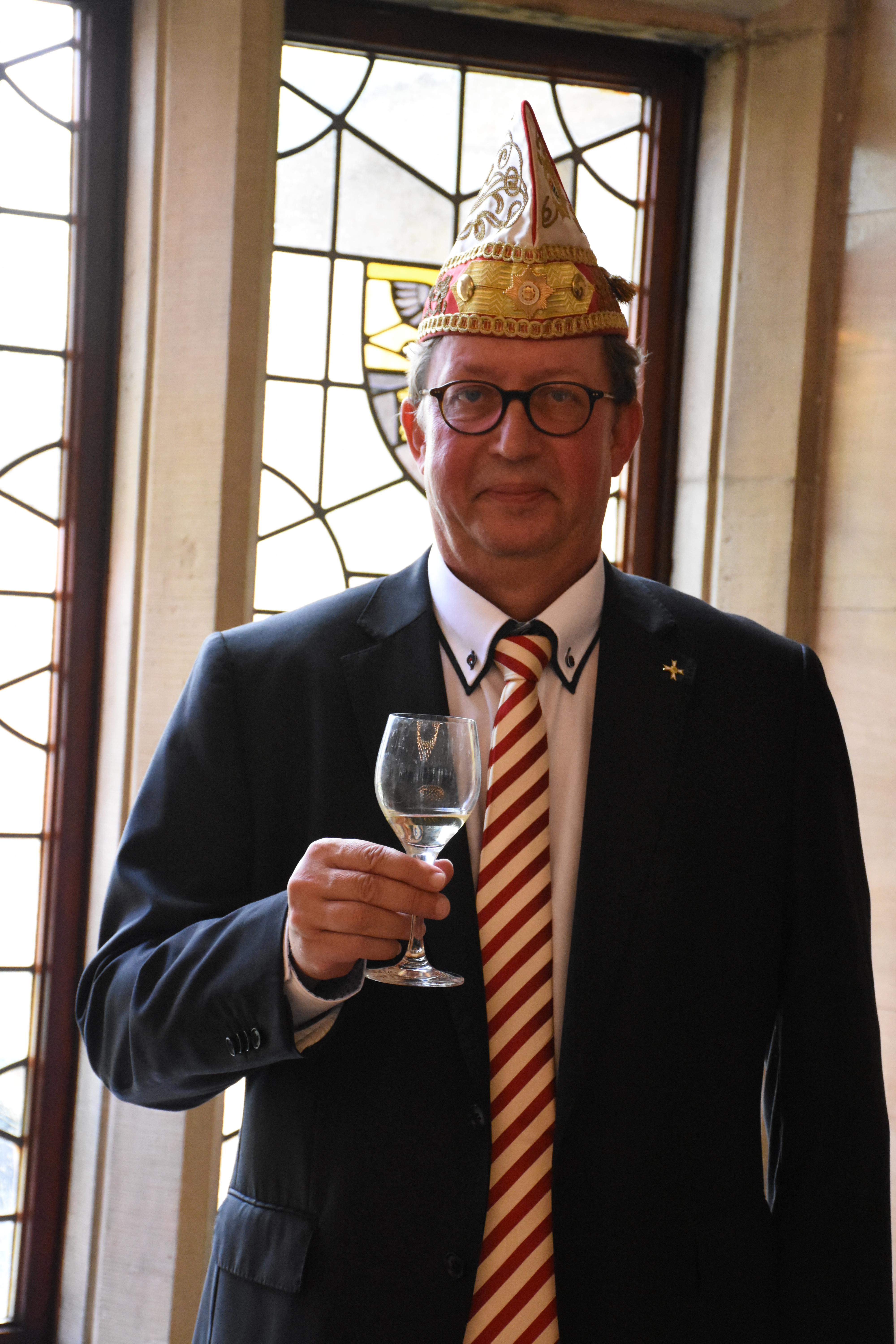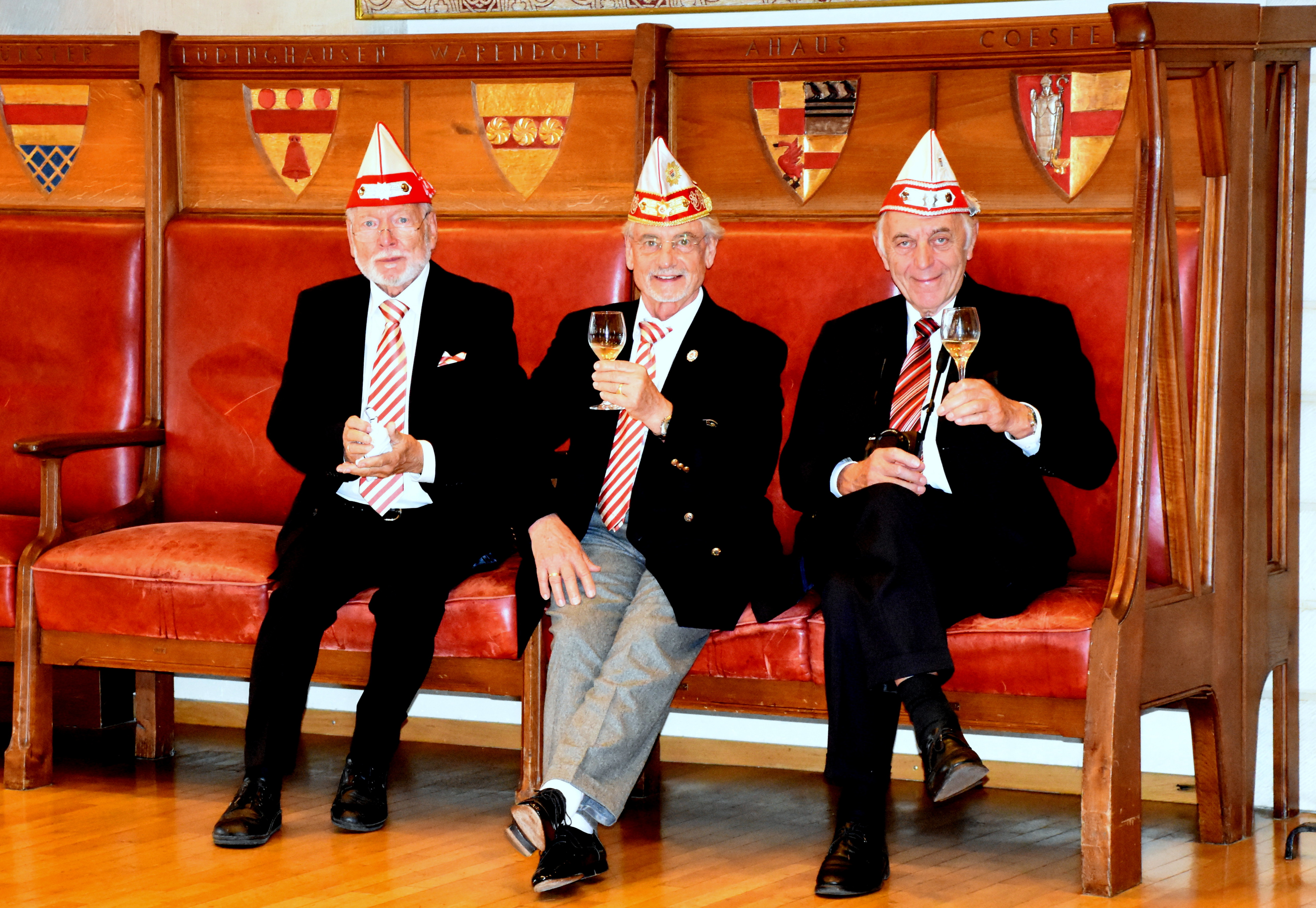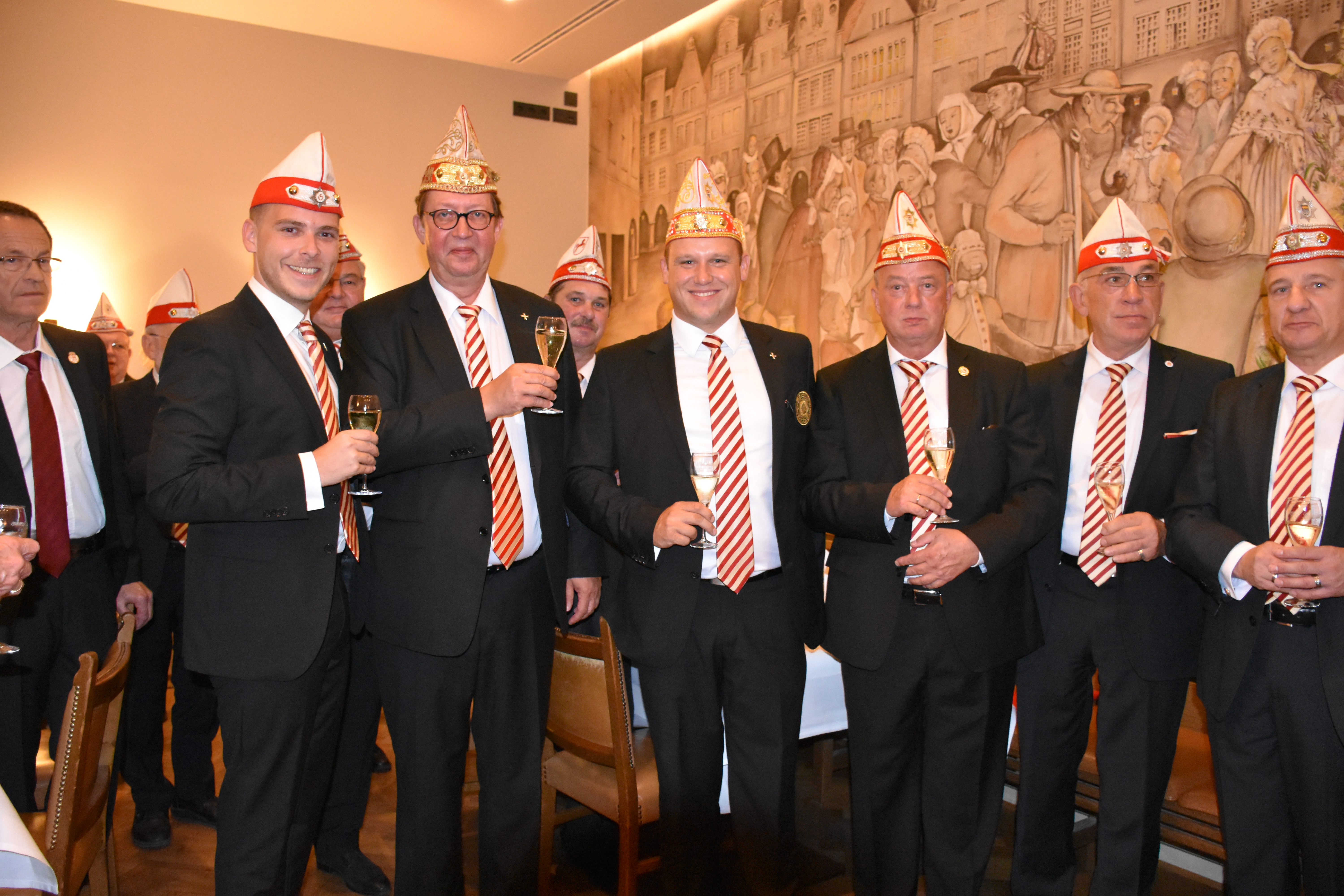 Zum Standardprogramm im Reservekorps gehört: Frühstück im Bus und etwas zu trinken gegen das Heimweh. Das haben die 26 Korpskameraden auch bei dieser Fahrt wieder gut angenommen. Unser Stadthotel in Münster lag sehr zentral, von daher gab es meist nur kurze Wege zu den verschiedenen Sehenswürdigkeiten. Gleich das erste Highlight war der Empfang im Friedenssaal des Rathauses durch Bürgermeister Herrn Joksch. Hier in diesem Saal wurde 1648 der Westfälische Frieden besiegelt. Reservekorpsführer Jürgen Wicharz bedankte sich beim Bürgermeister für den freundlichen Empfang und natürlich gab es als Gastgeschenk den Sessionsorden der PG. Und am Abend mal in einen Wasch Salon gehen? Warum eigentlich nicht. Das unterhaltsame Programm „Wasch Salon“ und ein drei Gänge Menü wartete im Varietee GOP auf die noch hellwachen Korpskameraden.